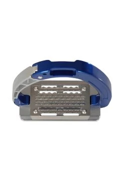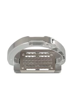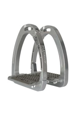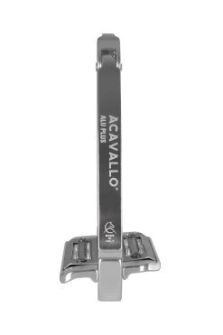 New premium model of the patented laterally opening Arena stirrups, completely made of certified high-grade anodized aluminum and fitted with a stainless steel tread. Acavallo has carefully chosen and combined the materials used, following detailed research and comprehensive testing. The aluminum, besides giving the stirrup a sleek and elegant appearance, is lightweight and extremely durable, while the stainless steel protects the tread from corrosion, guaranteeing a long life of the product, too. The opening of the stress-actuated locking and release mechanism is located a centimeter higher from the tread to ensure that the foot cannot slip out laterally by mistake and to prevent sand and dirt from delaying the opening action of the arm in case of an emergency. Long holes in the tread prevent sand and dirt accumulations so that the gripping effect is not compromised and a five degree inclination of the tread helps riders to assume the correct posture, relieving tension in their ankles, calves, knees and hips.