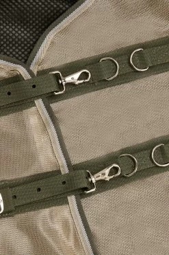 Our B Vertigo Jordan combi rug has both waterproof and breathable parts. Same goes for the detachable neck piece. Rug and neck piece close with double buckles, and the rug is kept in place by surcingles and tail strap with tail flap. High gussets do not restrict your horse’s movements. B Vertigo logo print adds an elegant detail.