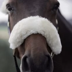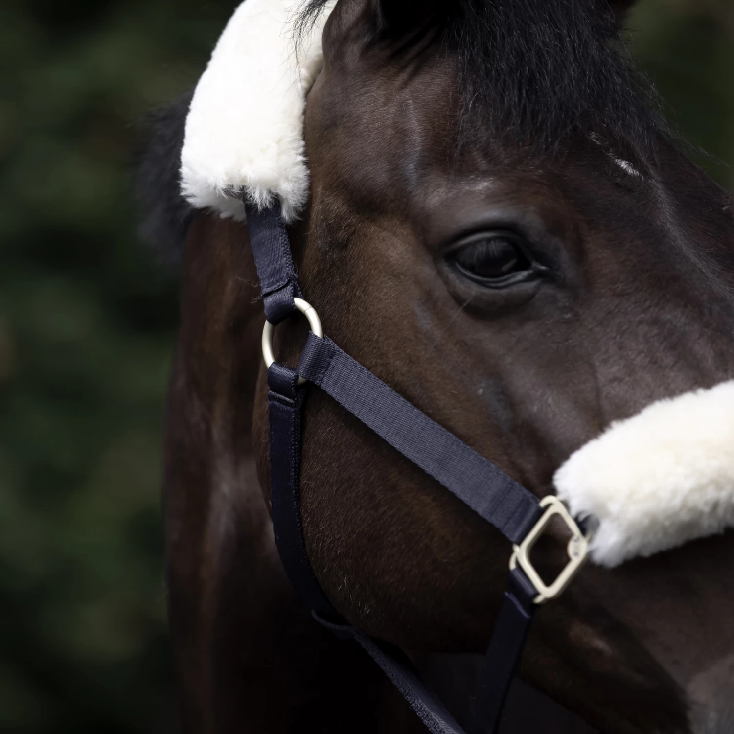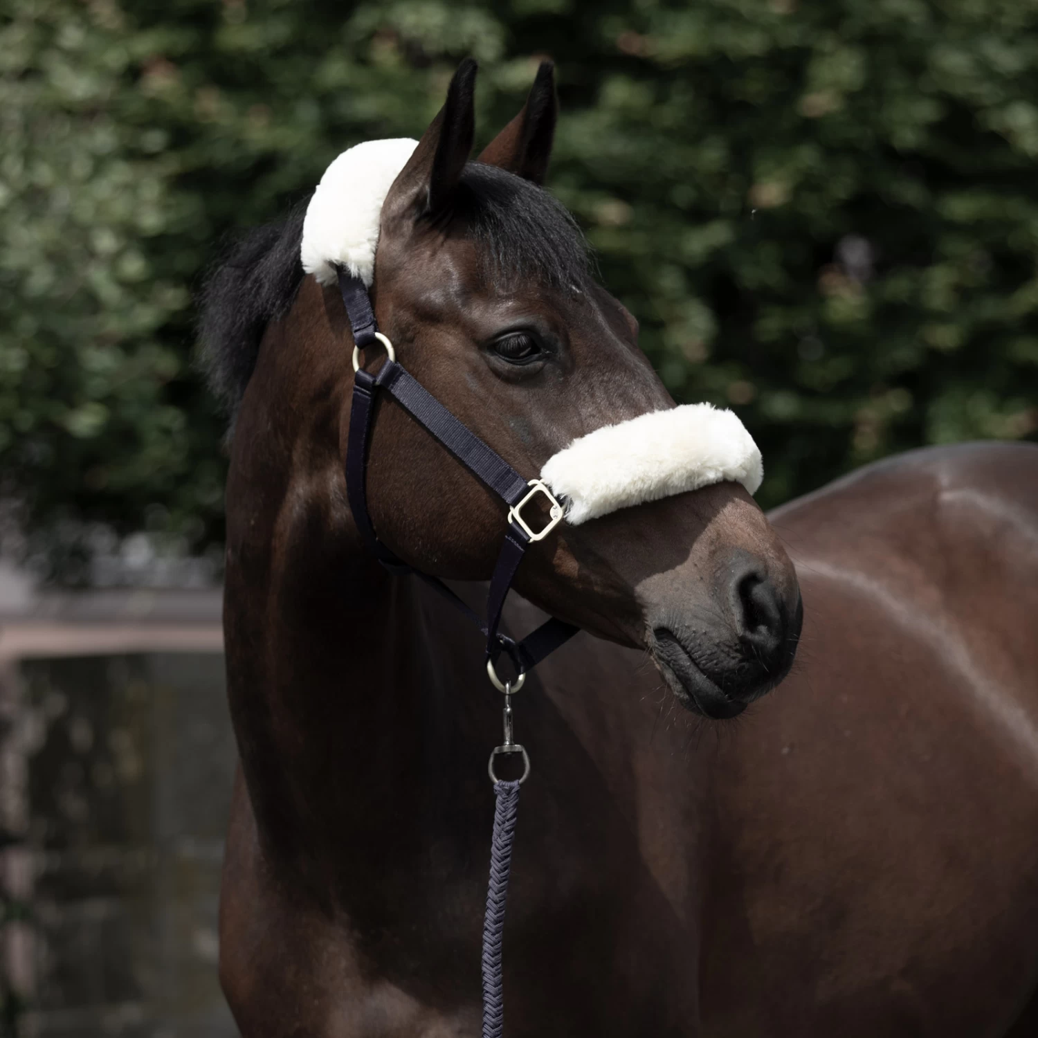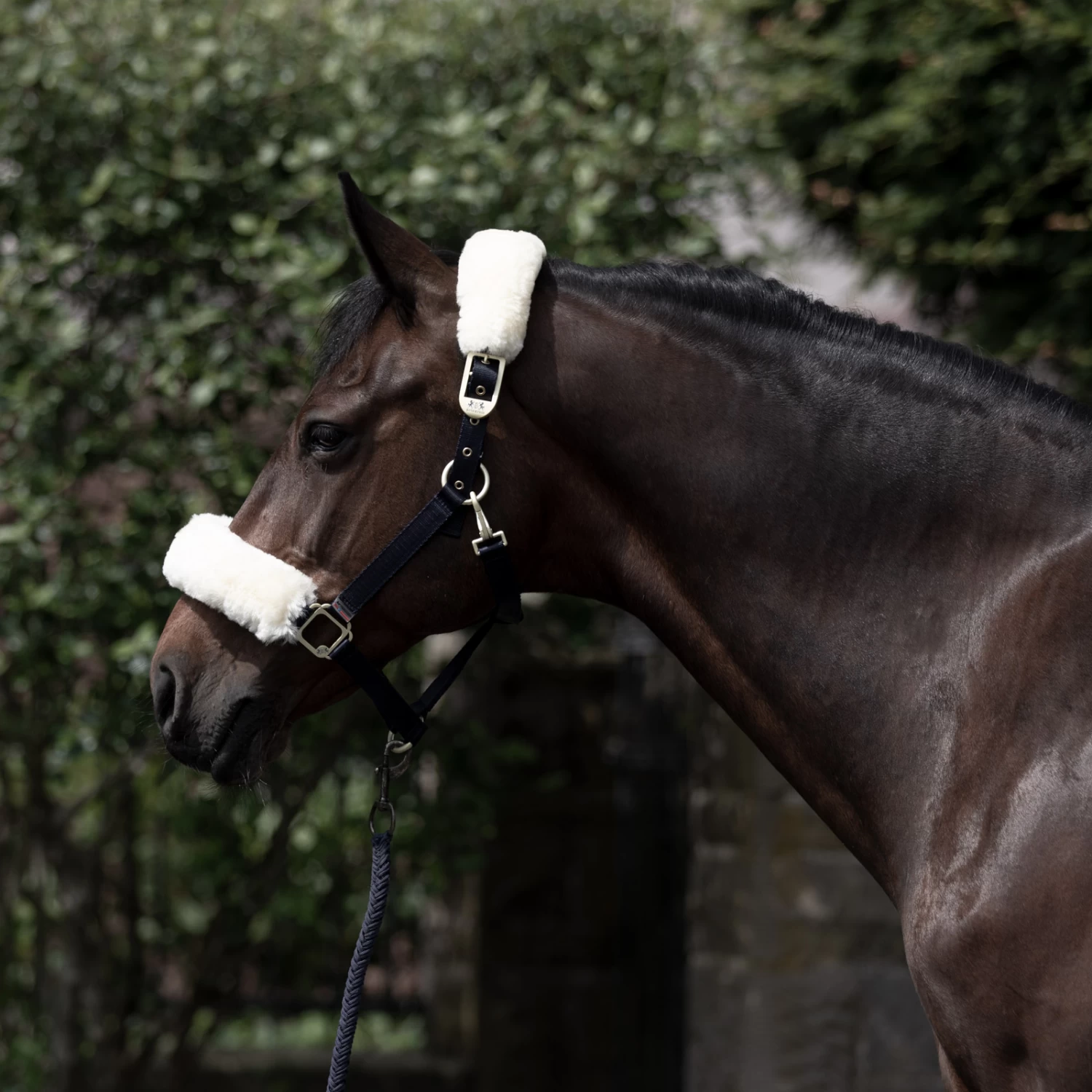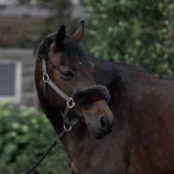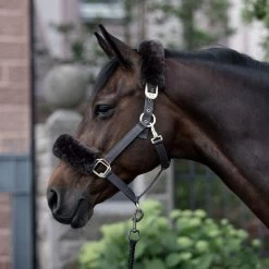 The B Vertigo Laurier halter is wrapped in soft, genuine sheepskin at the nose and crown to add comfort to these sensitive areas. Buckles on the crown adjust for the ideal fit, and a snap hook closes easily. Brass fittings match the fur perfectly and complete the classic look.