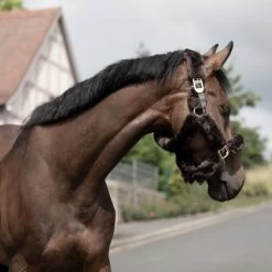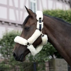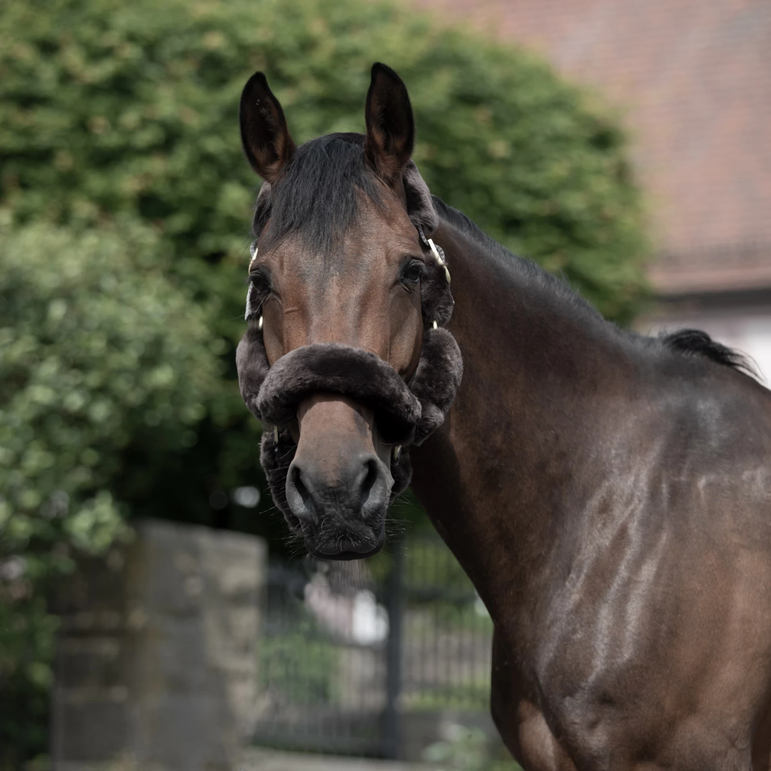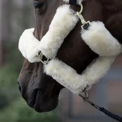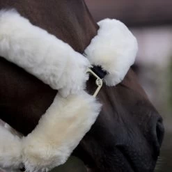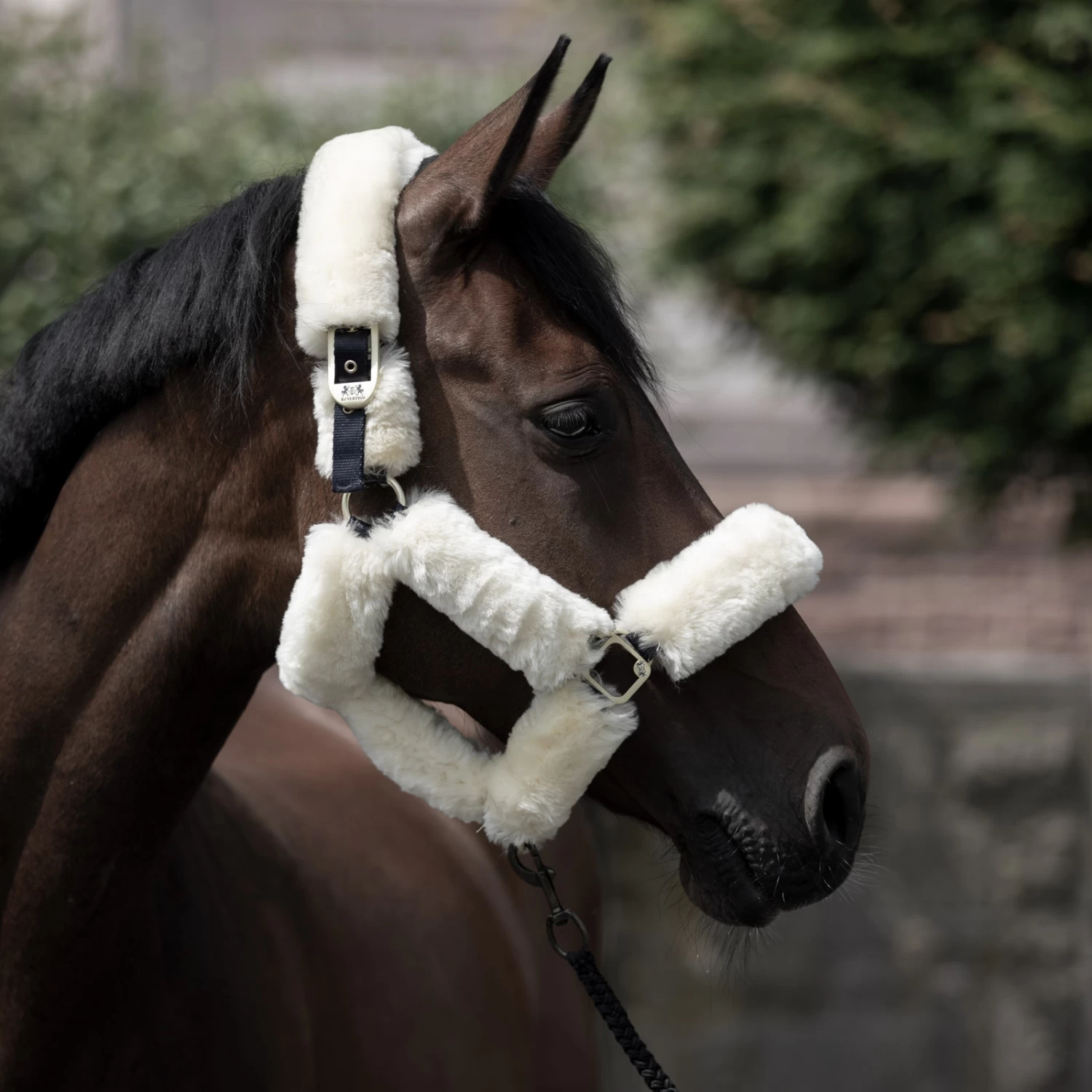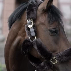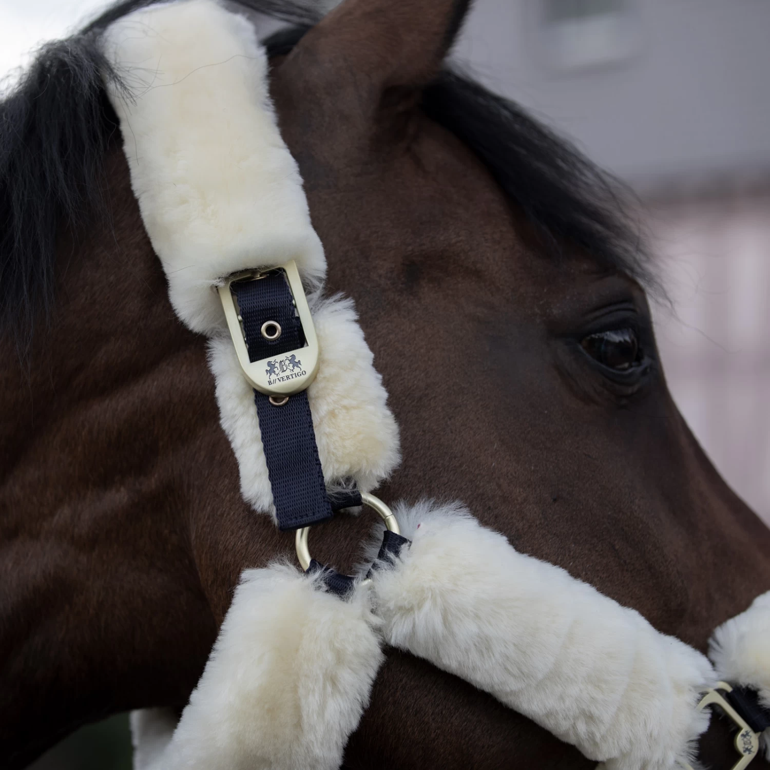 The B Vertigo Tremblant halter is fully wrapped in luxurious genuine sheepskin to cradle your horse’s head in comfort, and is the ultimate classic look. Buckles on the crown adjust for the ideal fit, and a snap hook closes easily. Brass fittings match the fur perfectly and complete the look.
