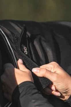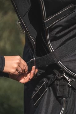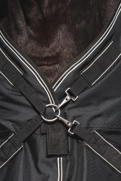 Obsidian is an utterly elegant multi-functional turnout rug with an assorted neck cover. The anatomical fit and the soft foam padding on top of the withers slightly lifts the rug to relieve pressure and increase comfort. The rug comes in three different thicknesses: the basic version with no filling (#3452310), a slightly thicker version with a 150g filling (#345231), and a warm version with a 300g filling, to meet the demands of cold winter conditions. Both rug and neck cover are composed of a breathable, water-repellent outer layer (5000mm-3000gsm) and an inner layer made from woven Welltex® fabric, closest to the horse’s coat. The sleek surface of the lining protects the fur from chafing, and the fabric provides an intense and powerful reflection of infrared energy. The large size of the rug allows for Welltex® to exert its therapeutic effect over a large area on the horse’s body. Obsidian envelops the horse in a soft embrace that can help stimulate blood flow to all the large, important muscle groups – making it an excellent choice before and after any activity as well as during rest and recovery. The effect may also contribute to improved joint mobility and ease of movement.The rug is kept in place by double chest buckles, crossed surcingles and a plastic-covered tail cord with D-rings. The design enables easy and sturdy attachment to Back on Track liners.