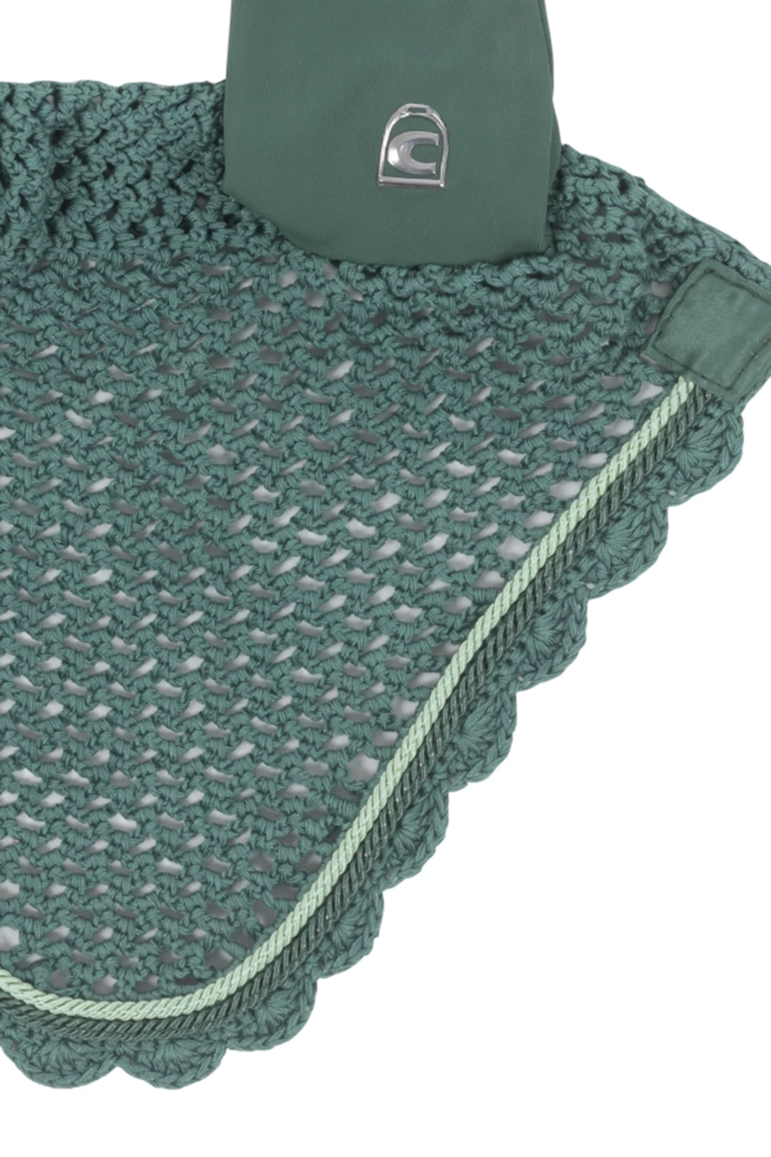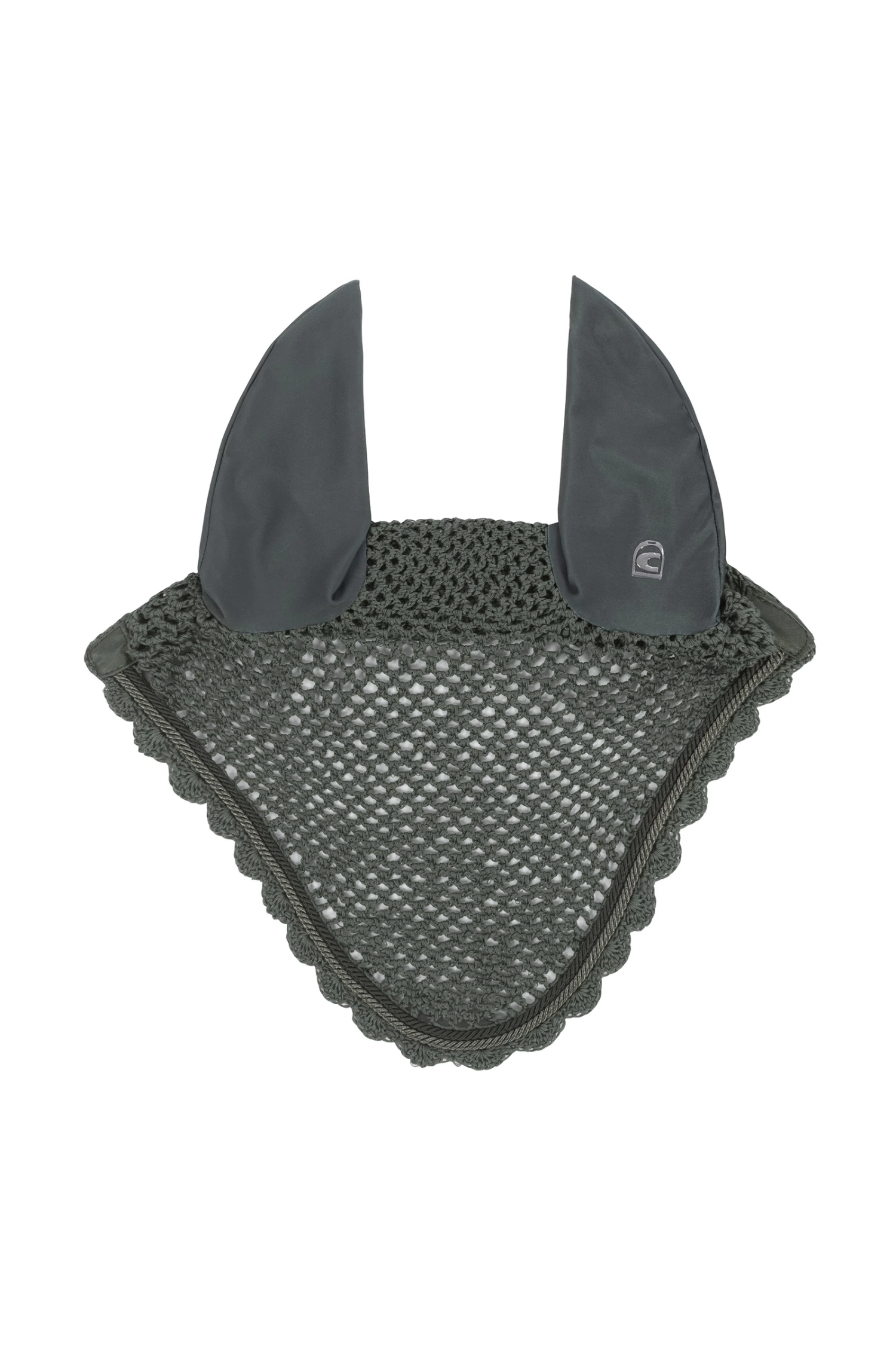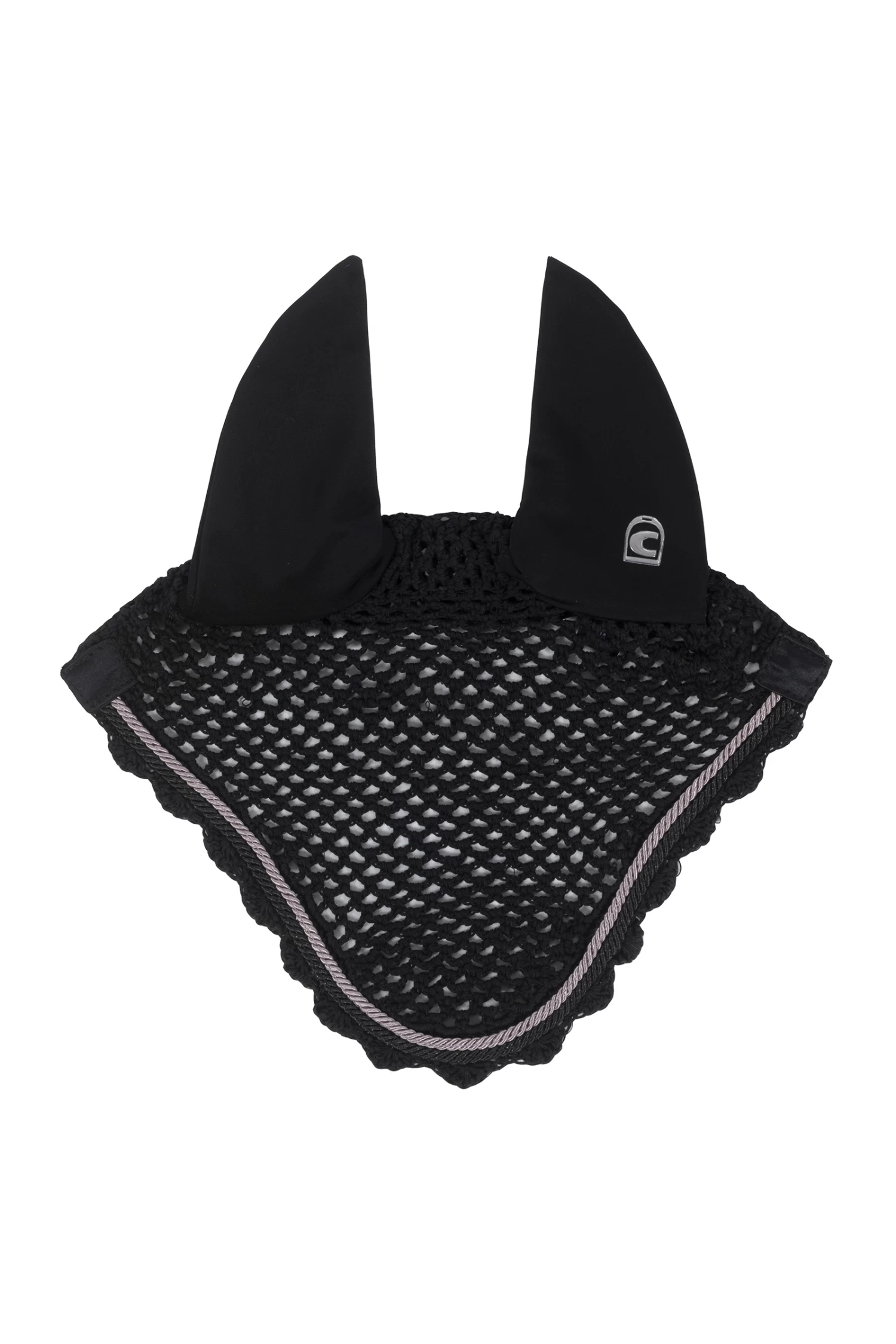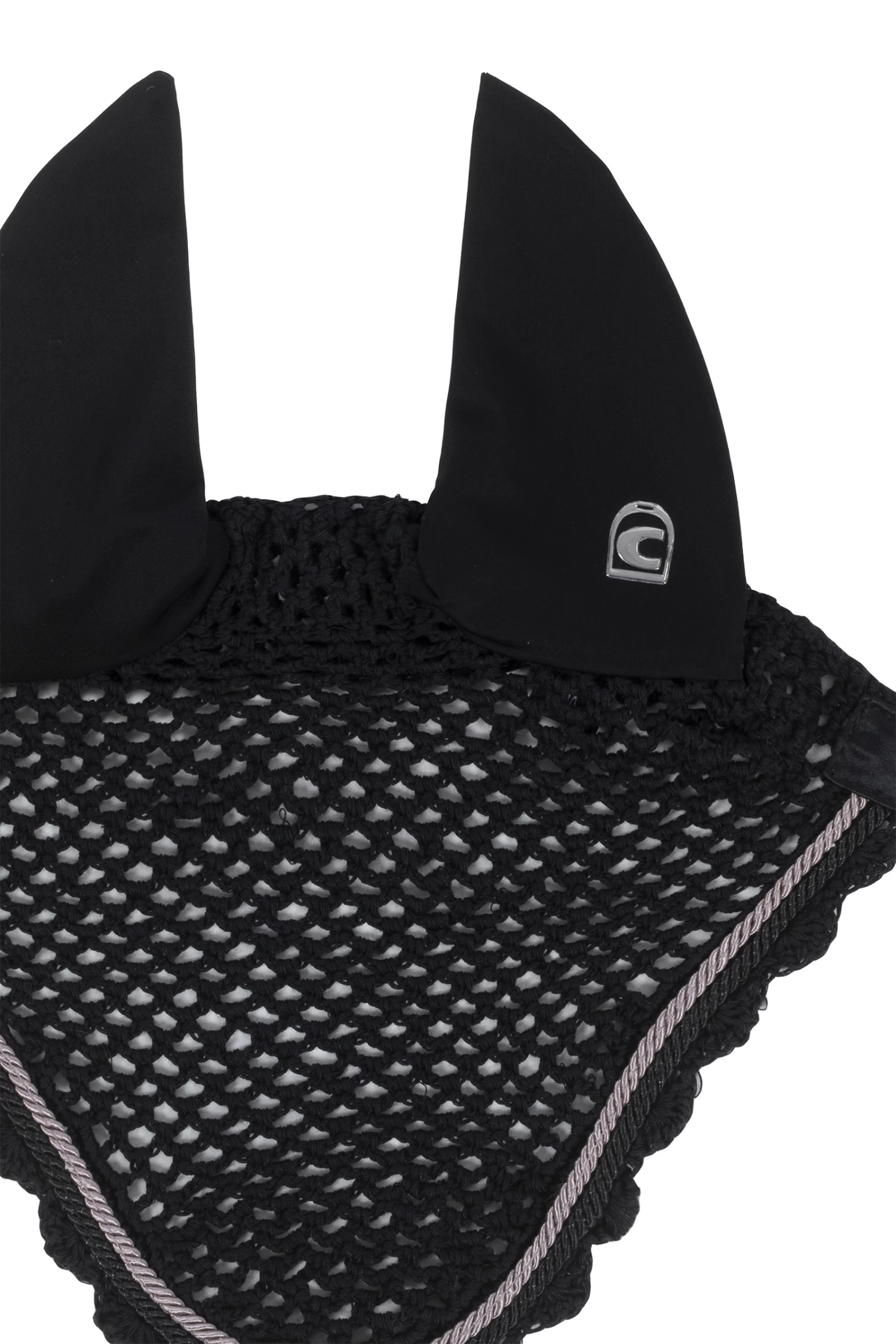 The left ear is printed with the Cavallo stirrup logo. Head cover in crochet look. Two small, contrasting coloured cords frame the fly hood.