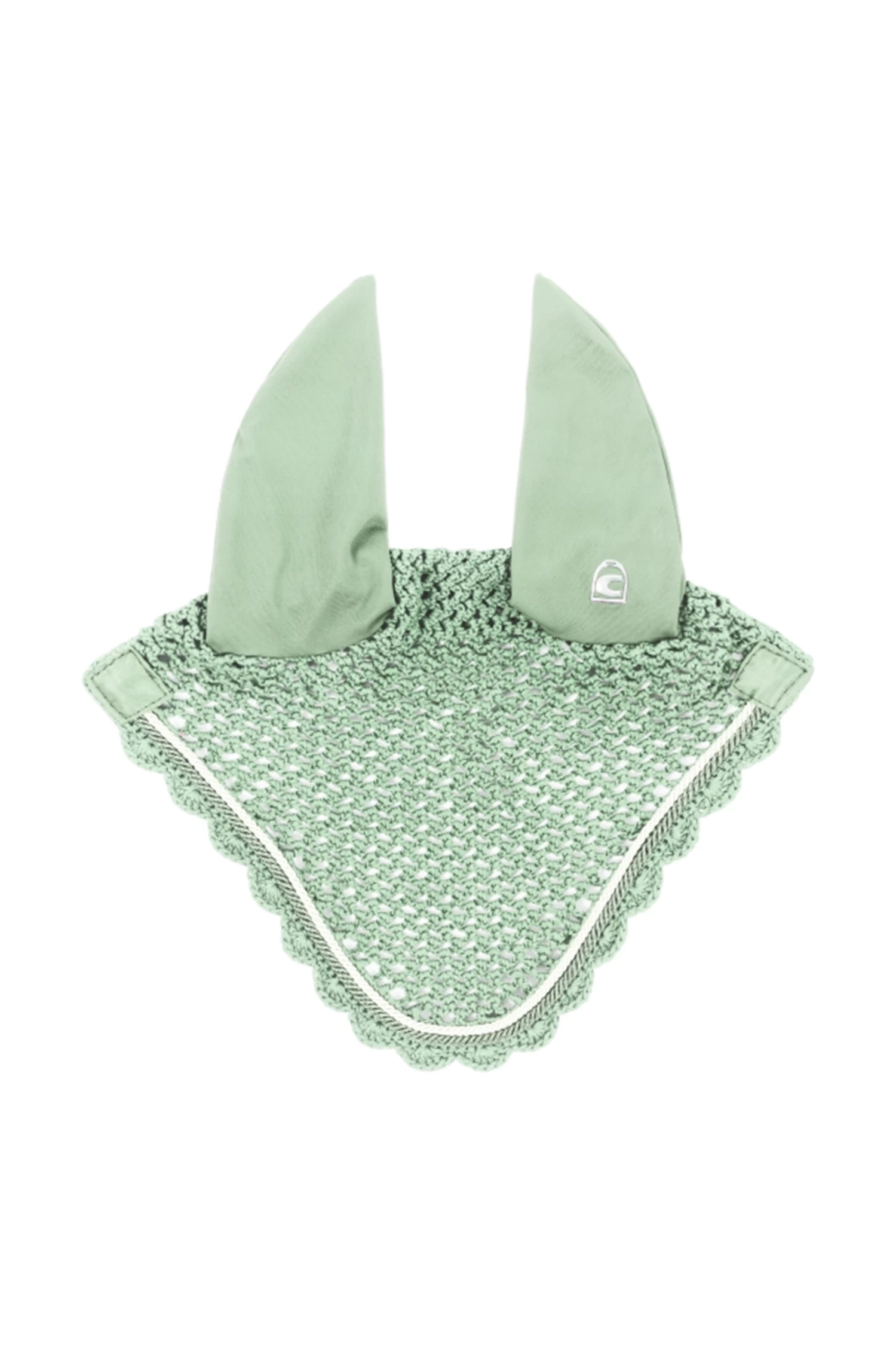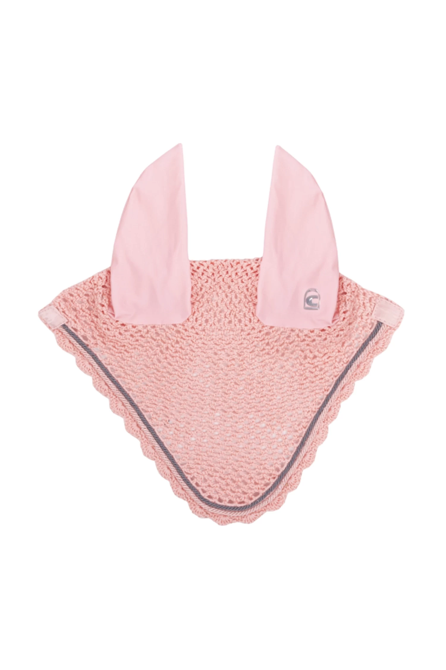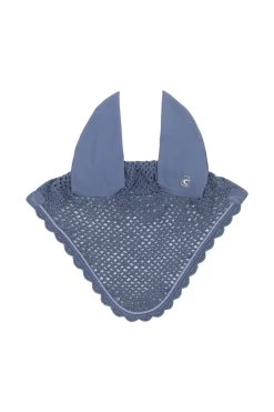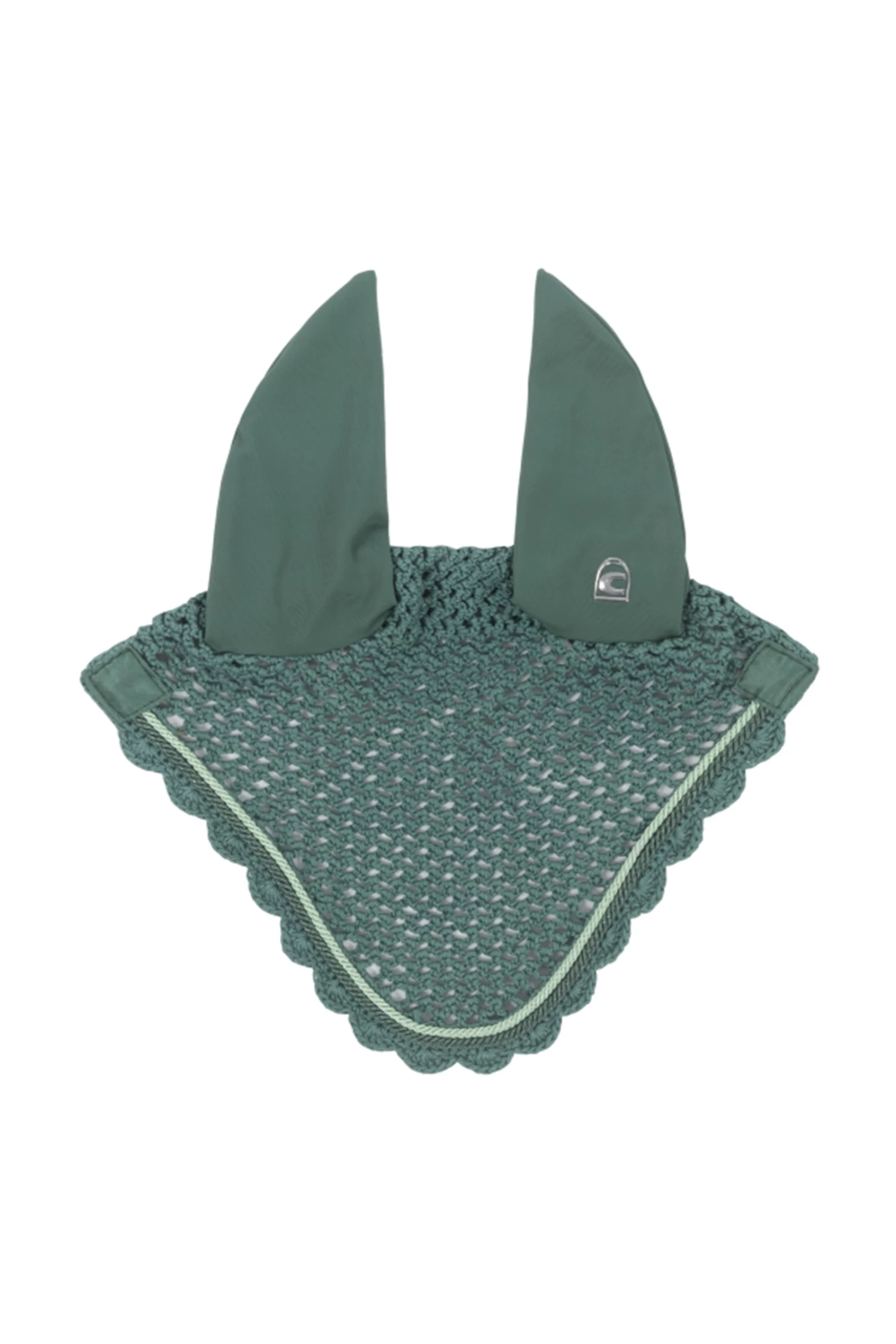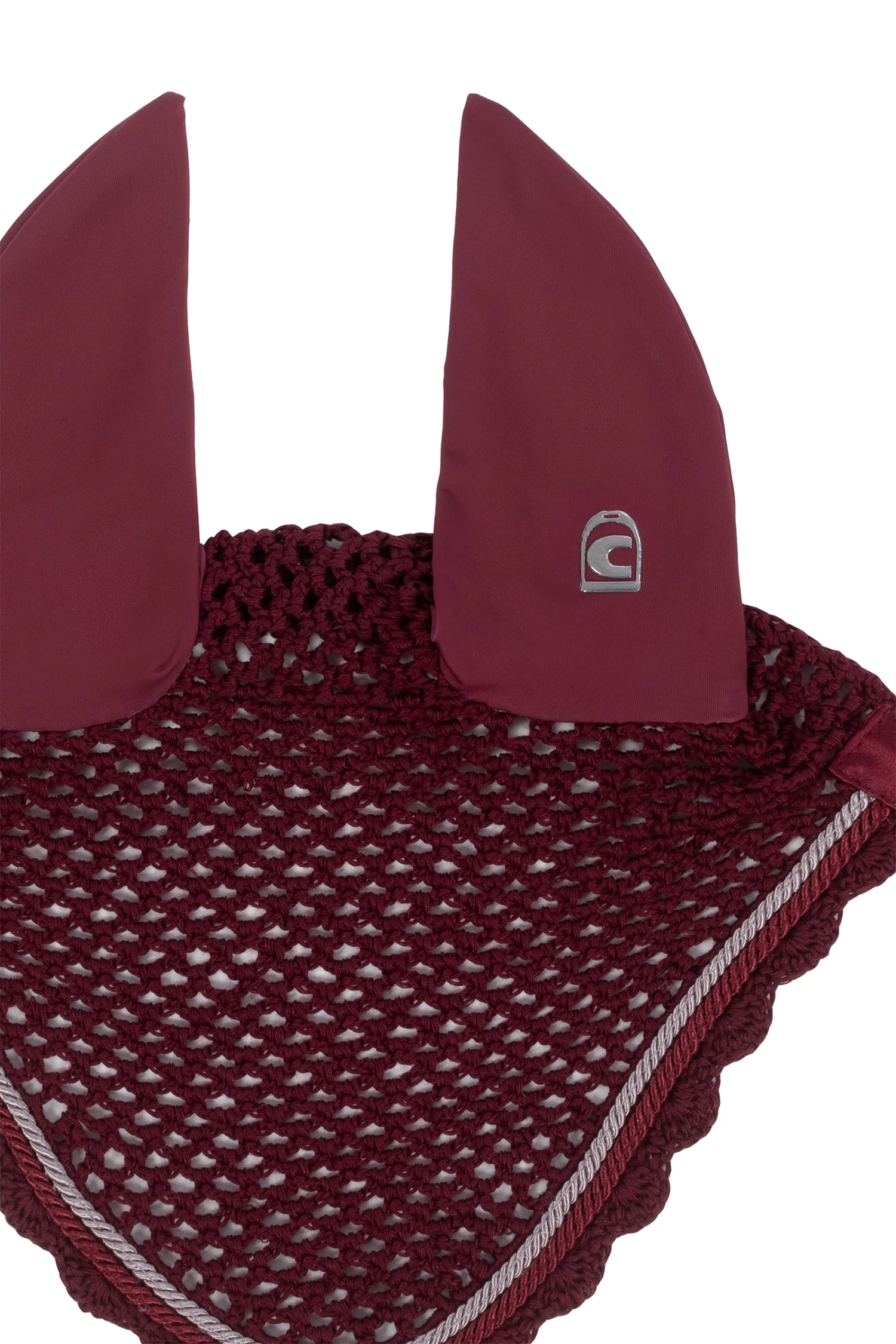 The left ear is printed with the Cavallo stirrup logo. Head cover in crochet look. Two small, contrasting coloured cords frame the fly hood.