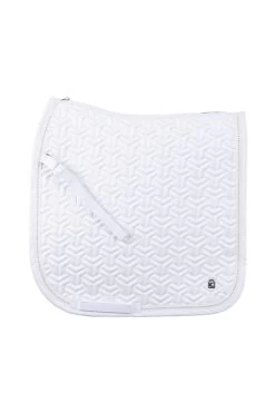 Saddle pad with elaborate quilted design in graphic look. Elegant look due to the shiny upper material. There is a crystal band between the two tapes on the border This decoration frames the saddle pad perfectly and is a real eye-catcher. On the back corners there is a high-quality Cavallo logo in gunmetal look. The quick-drying and moisture-transporting cool comfort mesh lining is particularly skin-friendly, cooling, durable and offers maximum comfort. A shape-retaining padding allows the saddle a perfect positioning on the horse’s back. The upper and lower girth straps are edged with satin ribbon. The upper girth straps are removable and the lower ones can be fixed with a touch tape fastener.