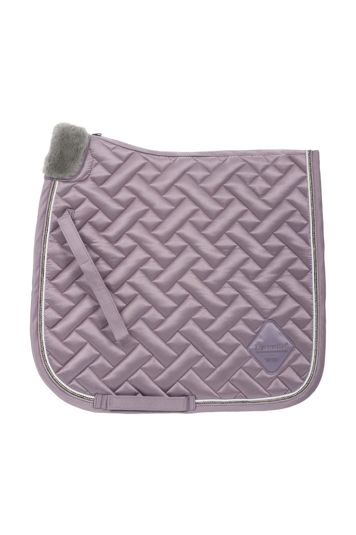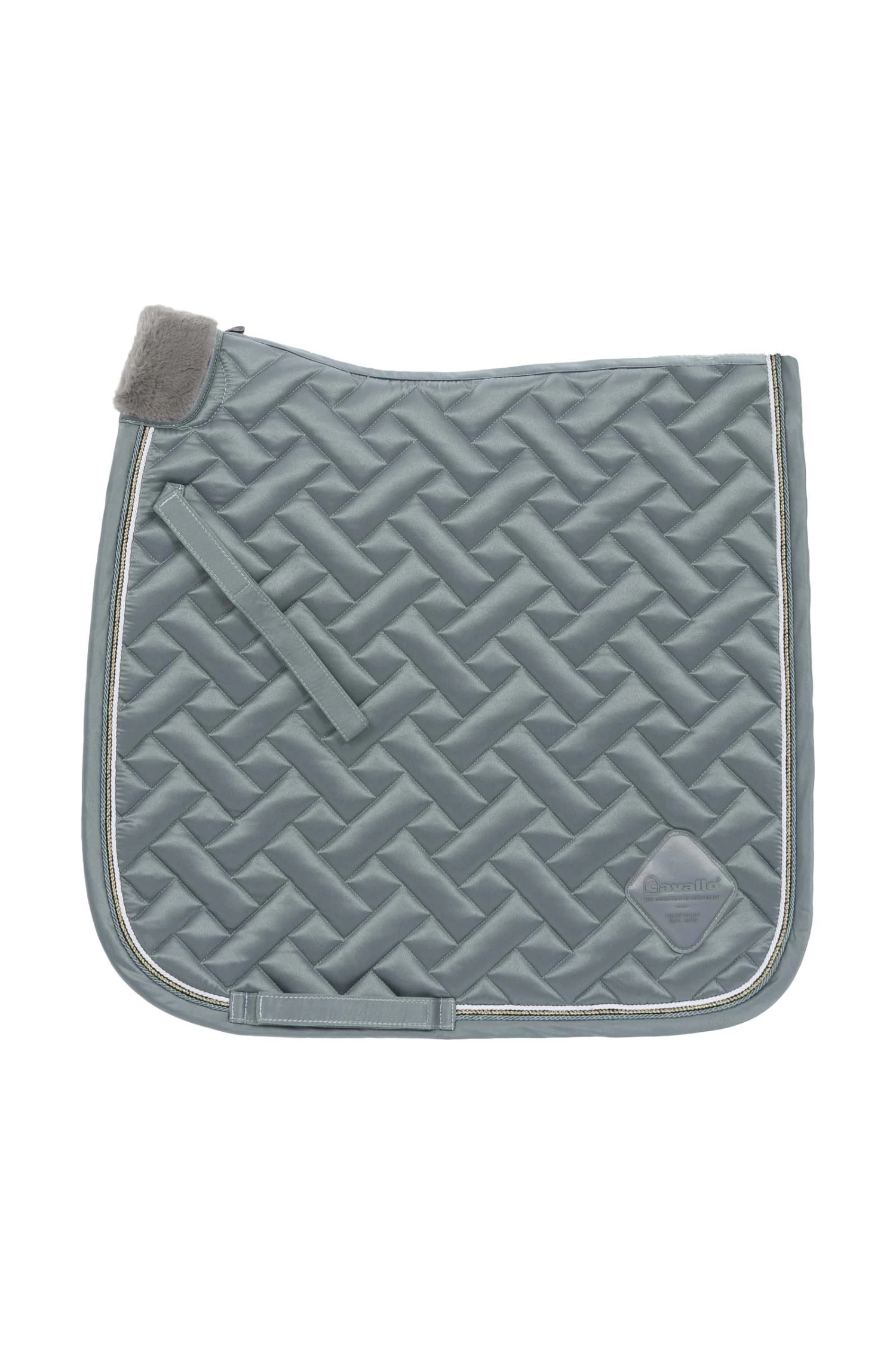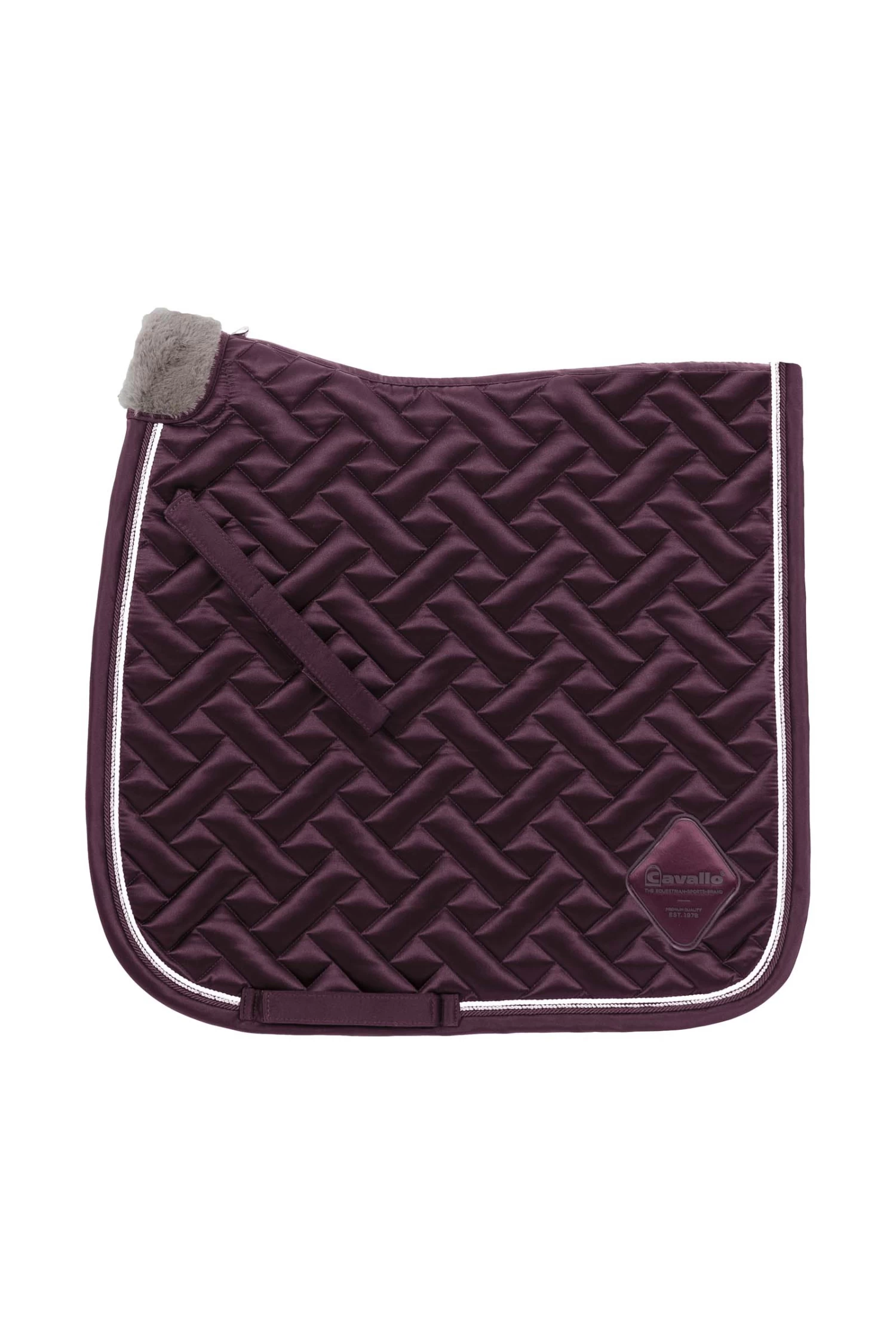 A saddle pad in a noble shimmering look. Allover with rectangular quilting. Equipped with a wither protector from soft fake fur. The saddle pad is framed by two narrow cords and a black tape/ribbon with golden, shimmering threads. A small tonal Cavallo patch.
