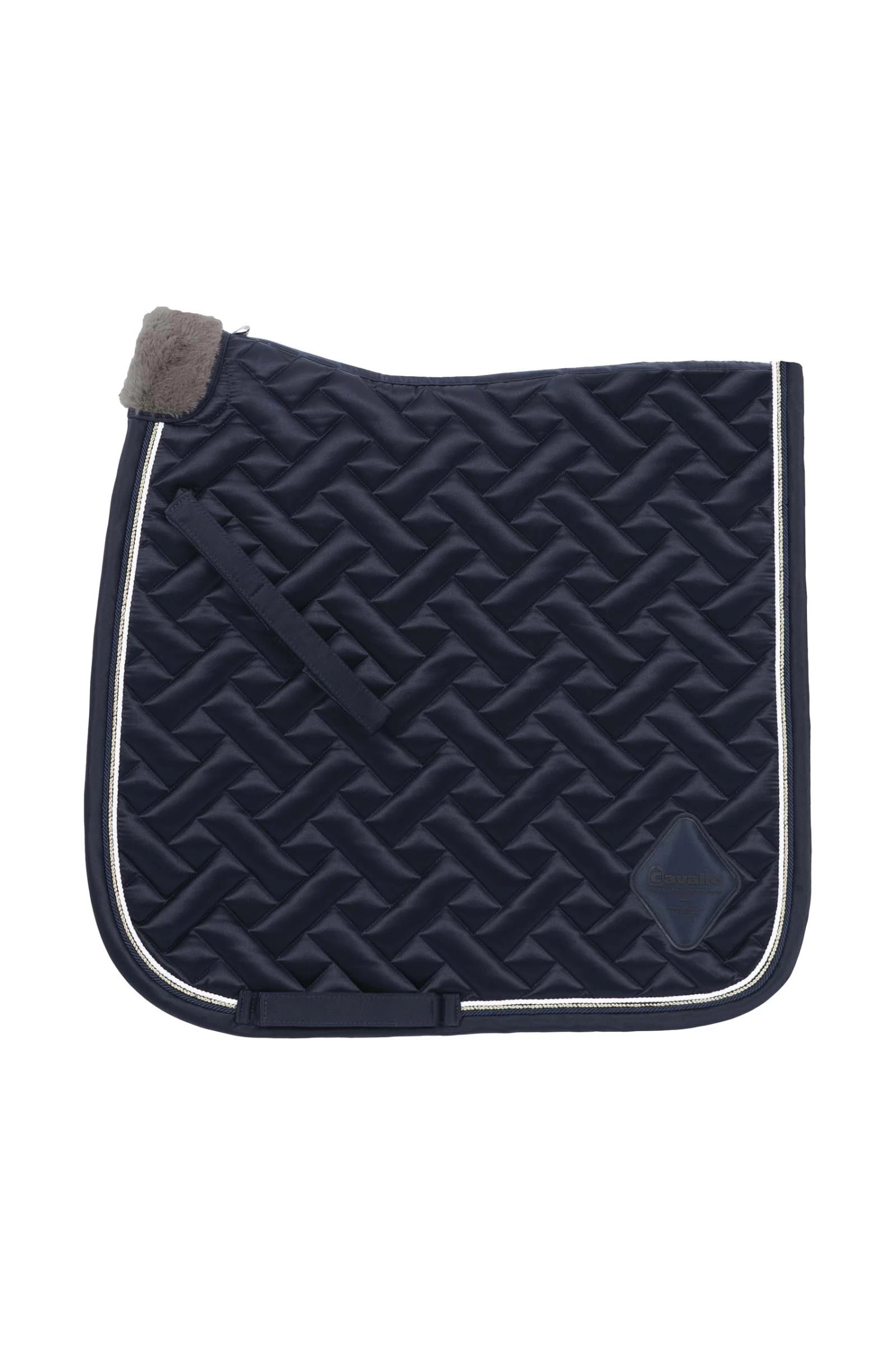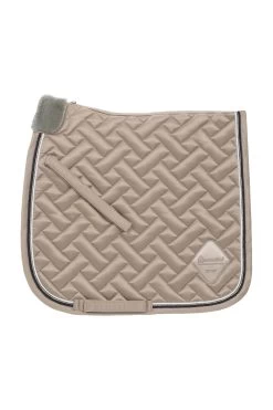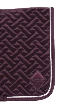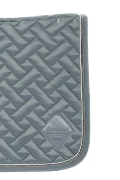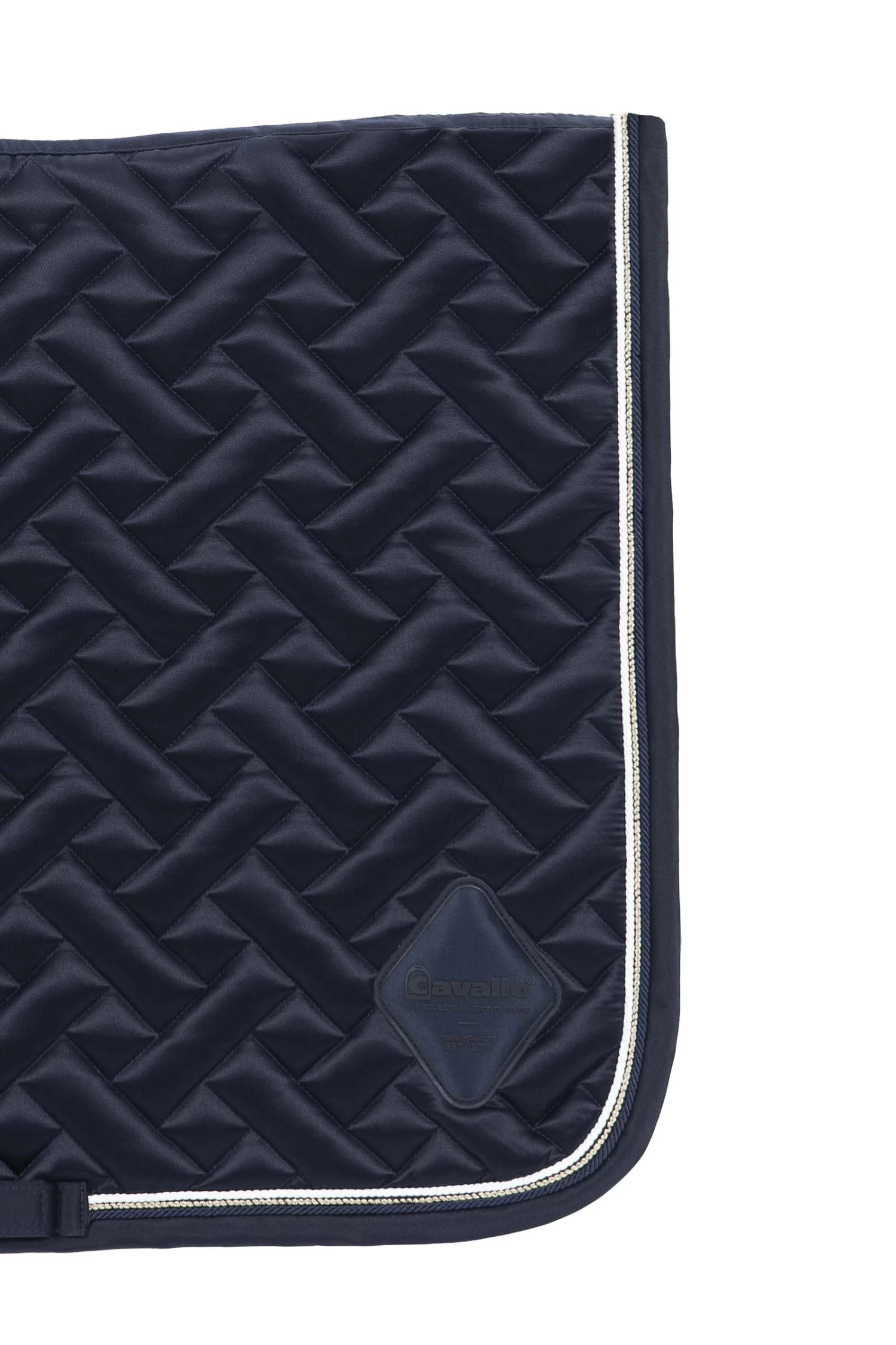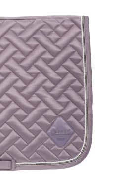 A saddle pad in a noble shimmering look. Allover with rectangular quilting. Equipped with a wither protector from soft fake fur. The saddle pad is framed by two narrow cords and a black tape/ribbon with golden, shimmering threads. A small tonal Cavallo patch.