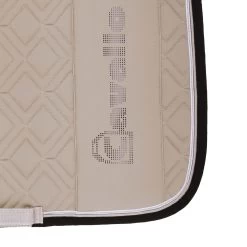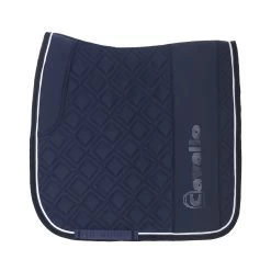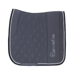 A sporty functional saddle pad made of elastic softshell material. The outer fabric made of softshell is particularly easy to care for. Double diamond quilting all over. Both sides have a vertical, smooth, tonal stripe on the back. On the stripe is a perforated, large, vertical Cavallo logo. There is shimmering reflective material under the holes of the Cavallo logo. The reinforcement made of memory foam at the front ensures an optimal position under the saddle. The saddle pad is framed by a white band with a narrow silver stripe. The quick-drying and moisture-wicking mesh lining is particularly fur-friendly and offers maximum comfort. A shape-retaining padding allows the saddle pad to lie perfectly on the horse’s back.
