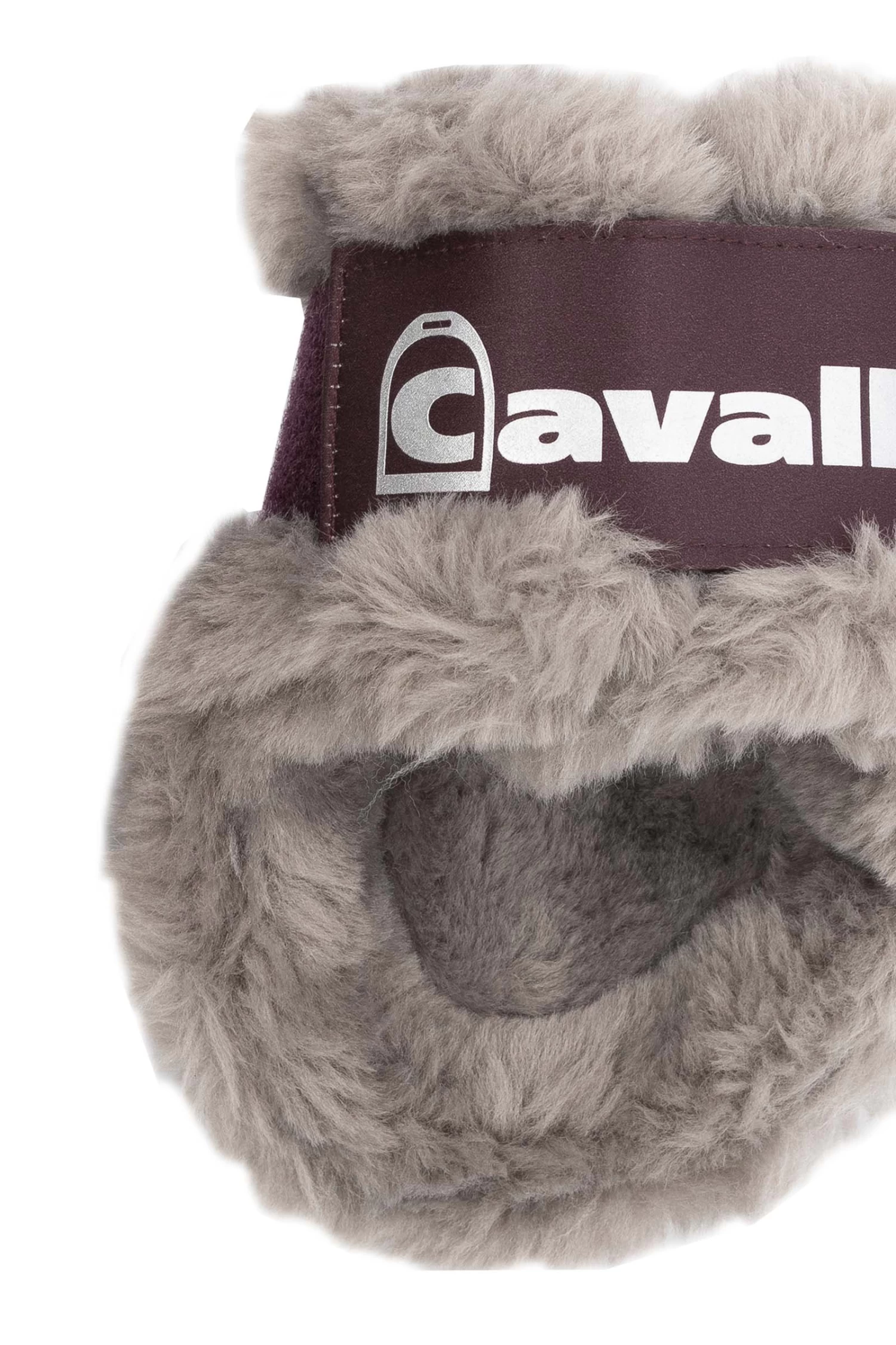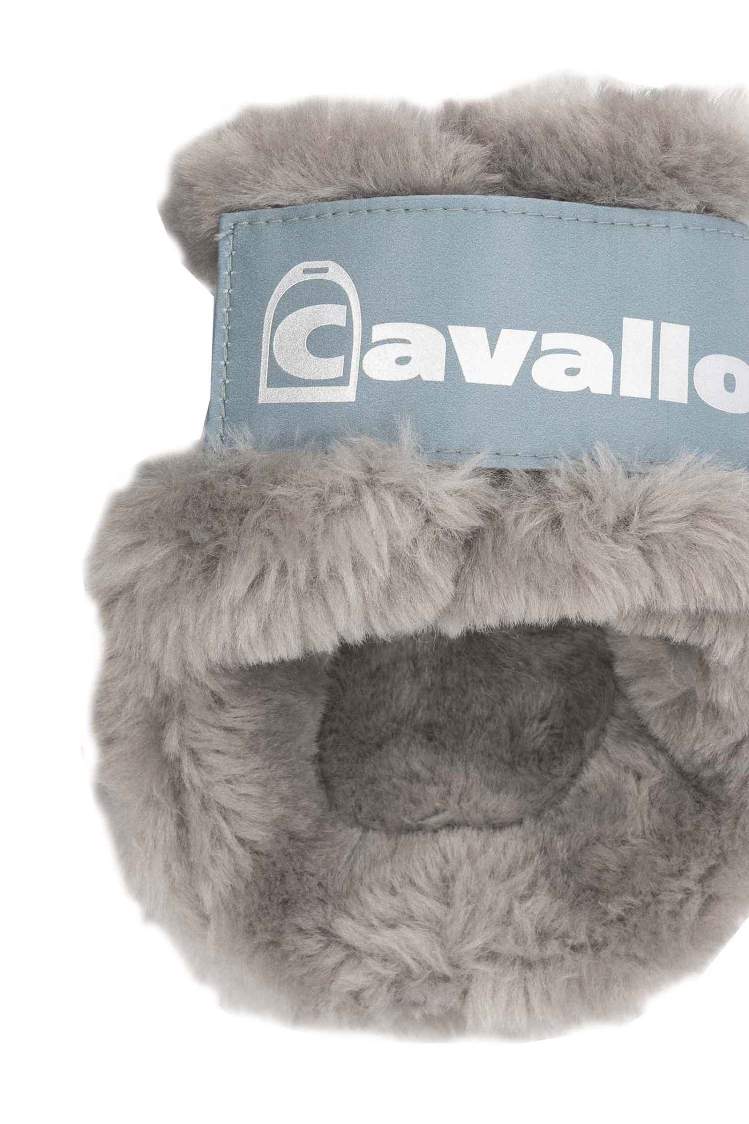 The inside of the boots is lined with fluffy fake fur. The fetlock boots are equipped with a wide elastic band and a velcro strap for closing on the outside. On the top of the velcro there is a large silver Cavallo logo printed on. The inside of the fetlock boot is printed with a large Cavallo stirrup logo.