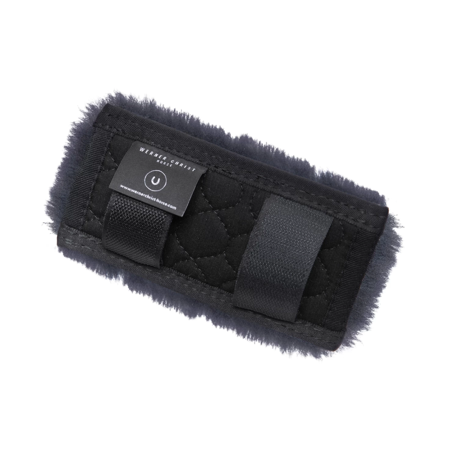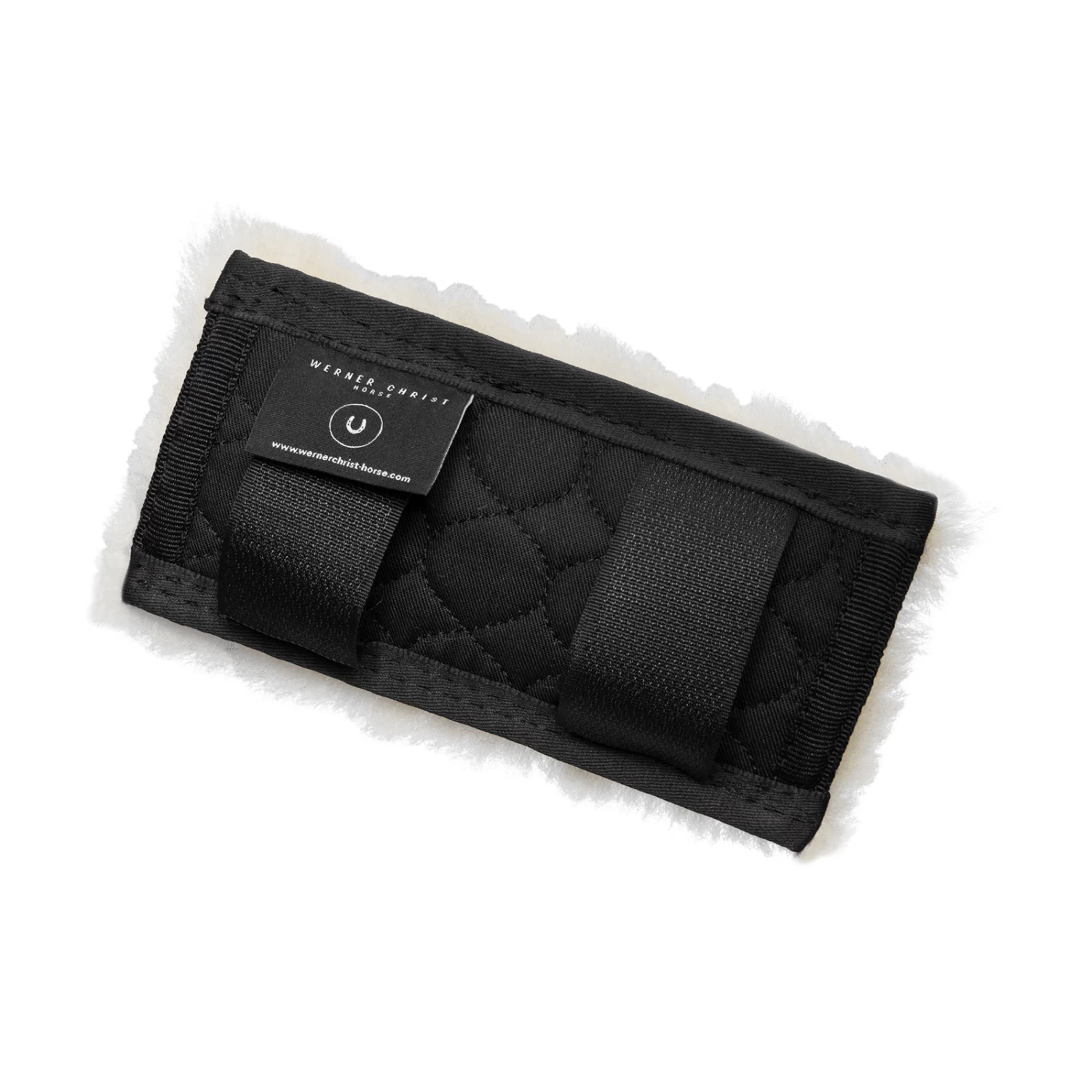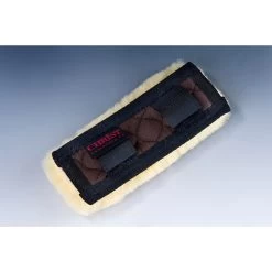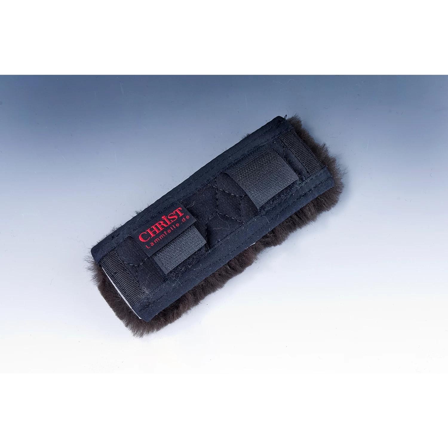 This cover is made of genuine lambskin and is held in position on the chinstrap or curb chain with hook and loop fasteners. The outside is reinforced with special saddle pad fabric and keeps the cover in shape. The depth of pile is approx. 20mm.