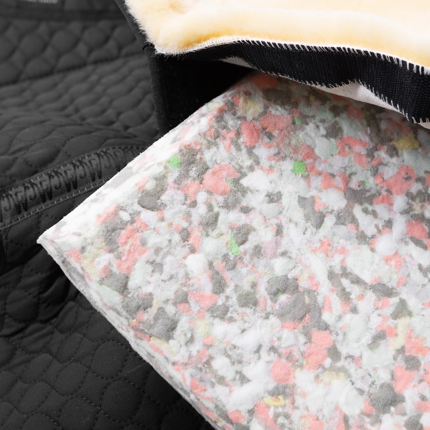 The shape is adapted to Western saddles with round skirts. The underside is completely covered with sheepskin. Pads can be inserted into the integrated pockets/chambers. The withers are cut out. A strong nylon chafing guard prevents permanent damage from the girth. Supplied without pads. These can be ordered as an option.