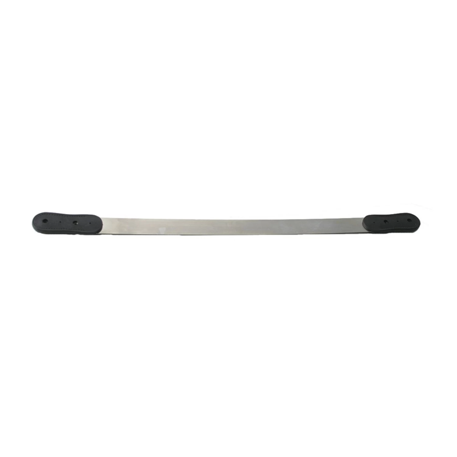 Smooth metal sweat scraper with rubber hand grips on either ends.