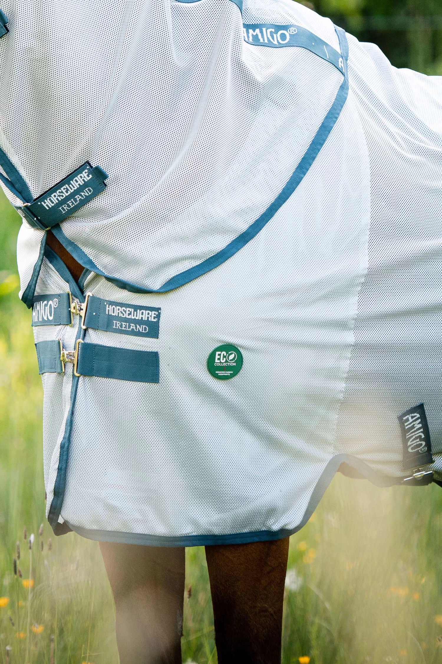 Horseware Ireland’s first bug rug made from post consumer recycled plastic bottles. Front leg arches, classic front closure, silky tail, shoulder and mane lining, cross surcingles, removable neck cover and silver colour to reflect sunlight.