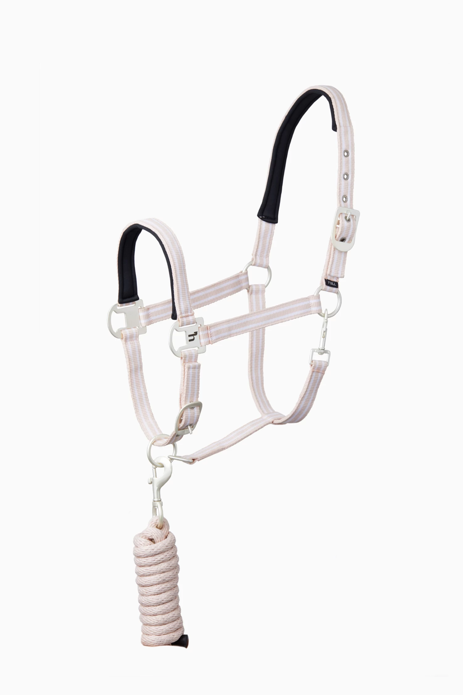 The Horze Bari halter is made from striped webbing material, and softly lined with neoprene at neck and nose. Adjustable buckles ensure the perfect fit, and the snap hook closes safely. The Bari lead is made from braided rope that is easy to hold, and equipped with a strong snap hook.