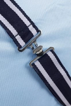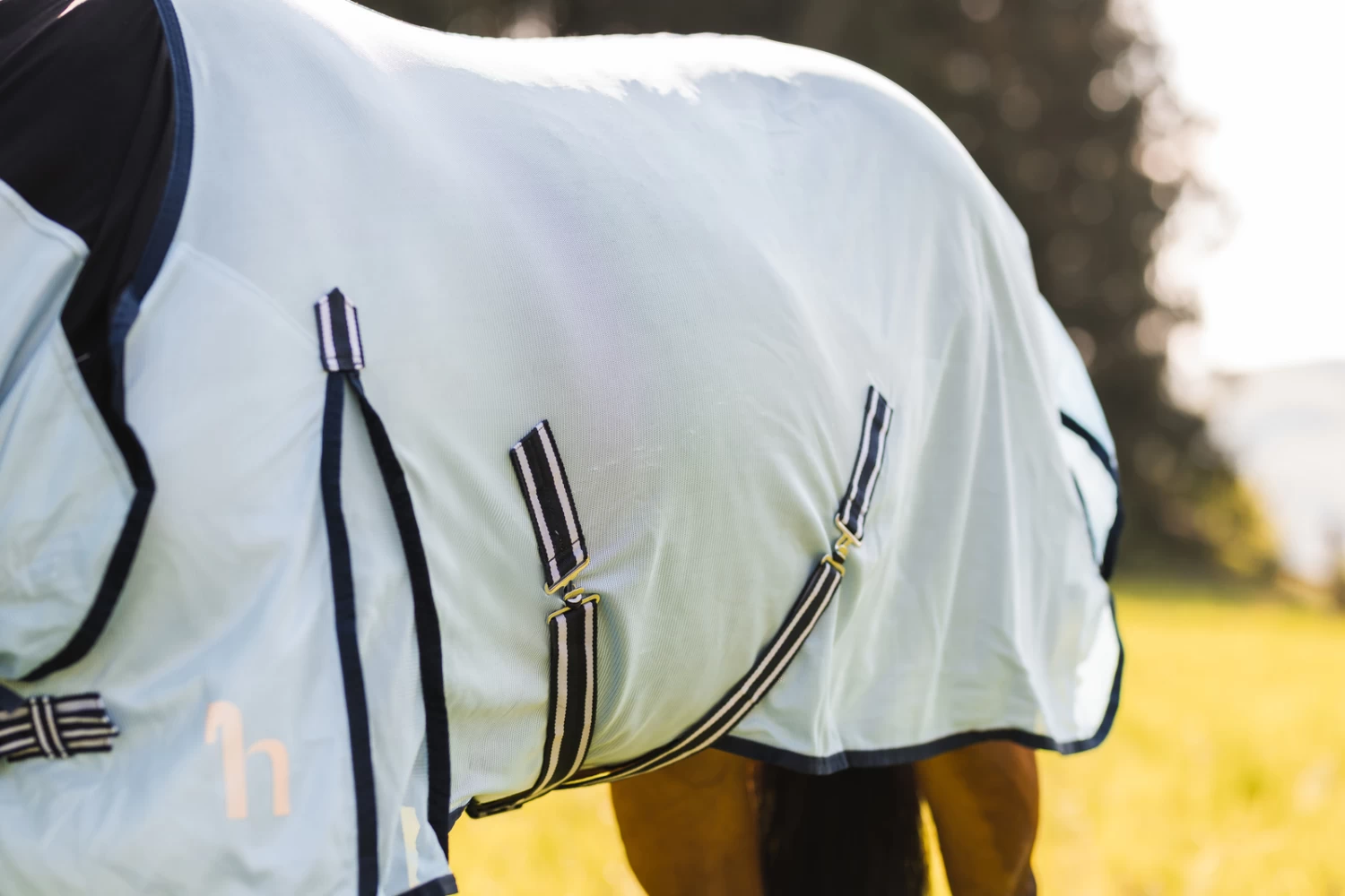 Shield your horse from annoying summer insects with this stylish and cool fly rug. A lightweight yet high quality fly rug made of strong mesh fabric with UV-protective treatment for extra sun block is breathable and cool for summer comfort. The insert with stretchable fabric at the neck/wither area gives plenty of freedom of movement for your horse to play and romp in the paddock. Nice striped webbing adds style to this attractive sheet.