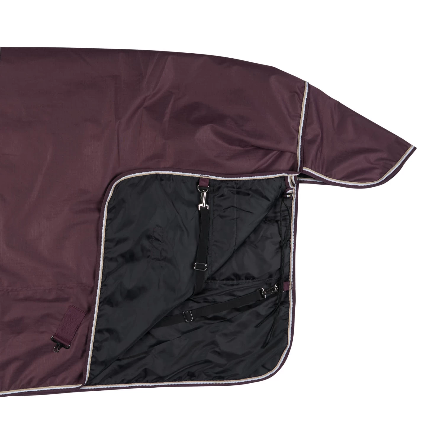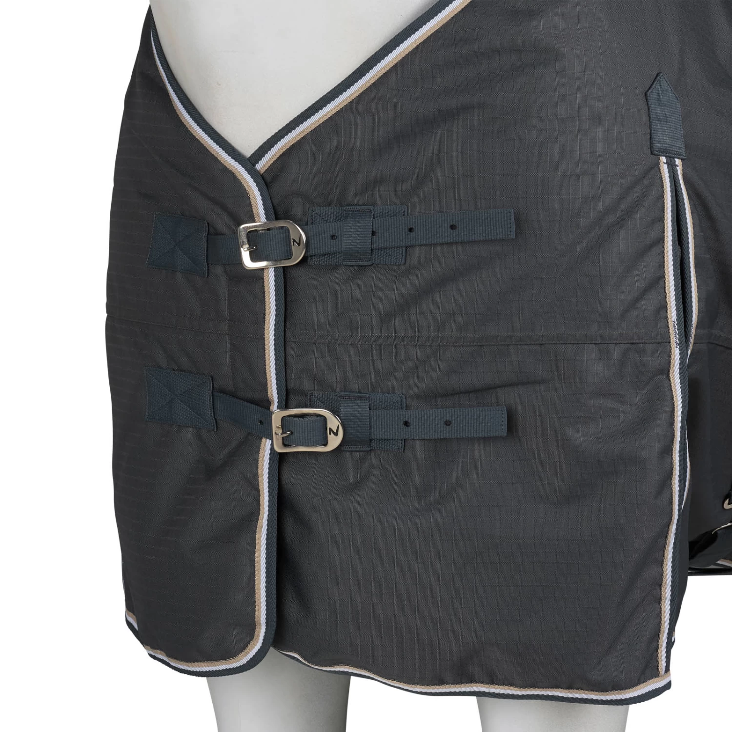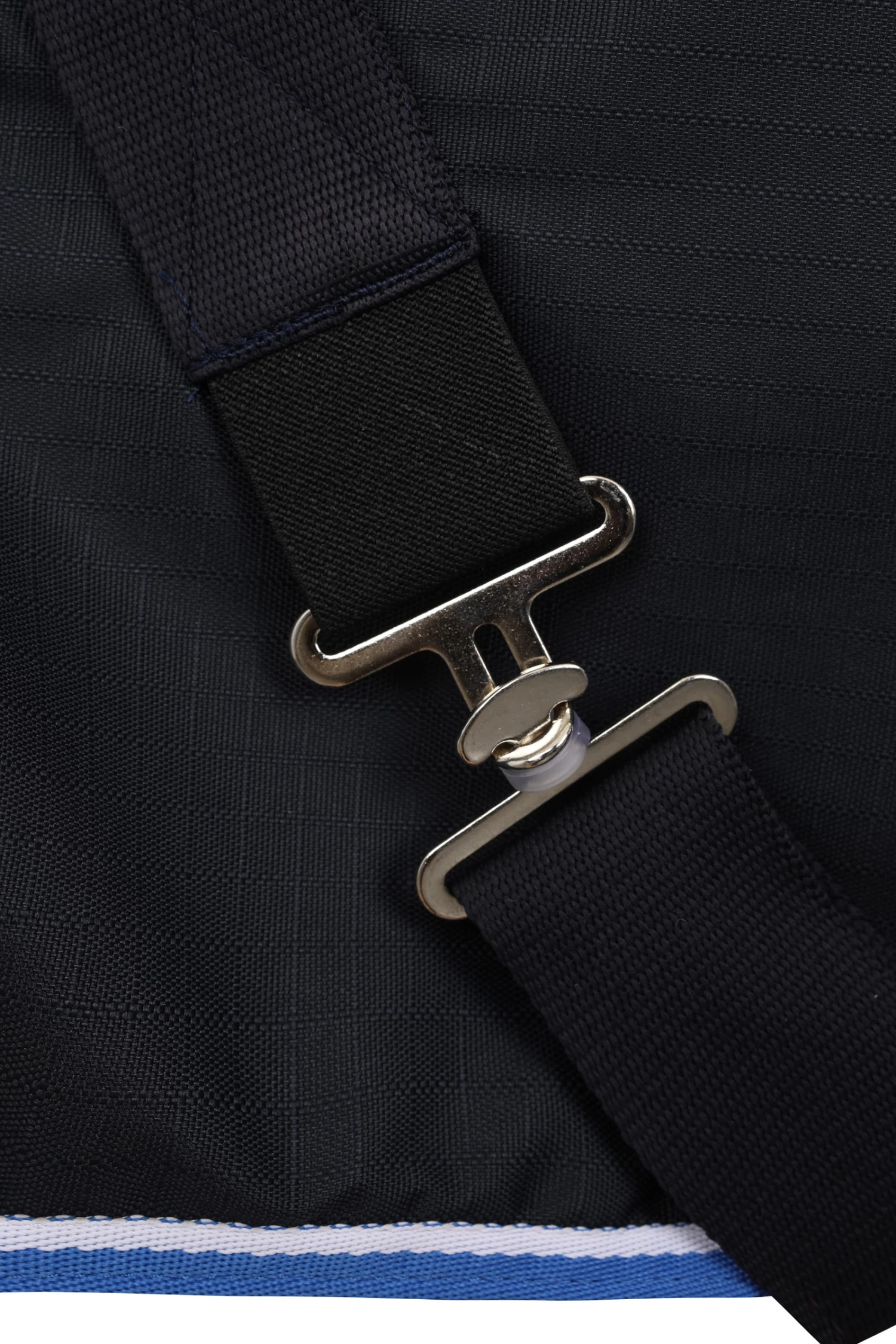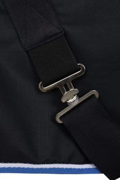 This rug is made from a waterproof, breathable fabric. The good fit at the neck and shoulder area makes it comfortable, and the high gusset allows lots of movement. The front buckles, X-surcingles, legstraps and tailflap secure the turnout.