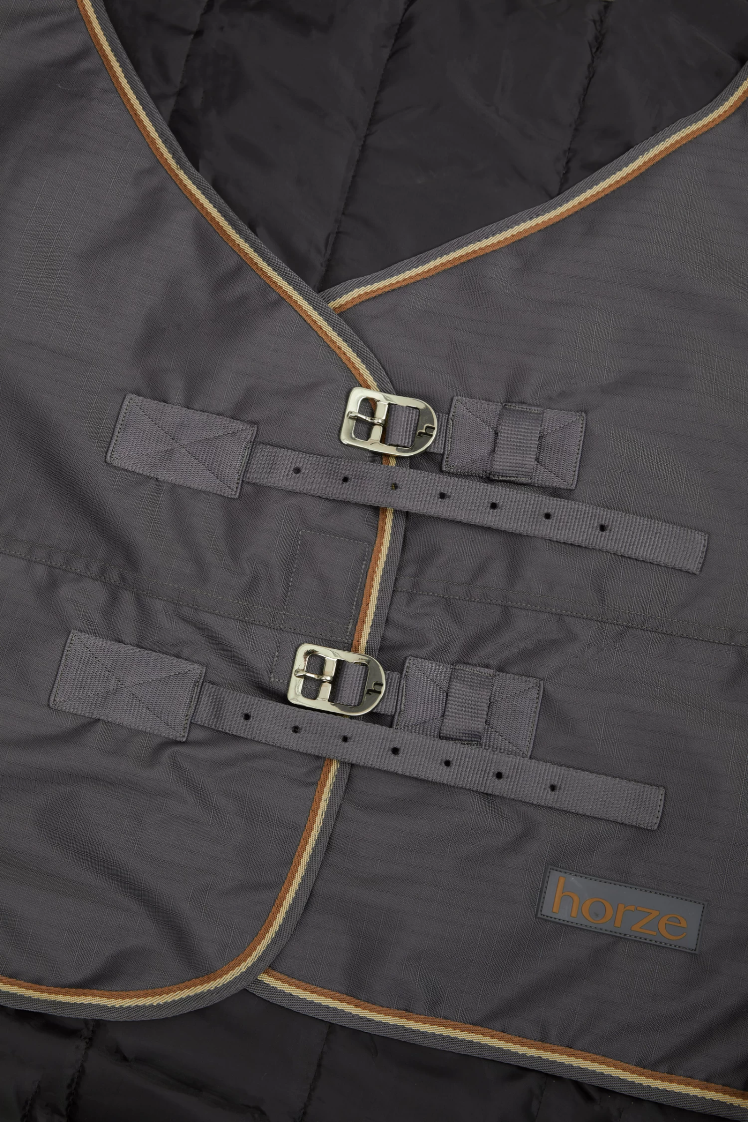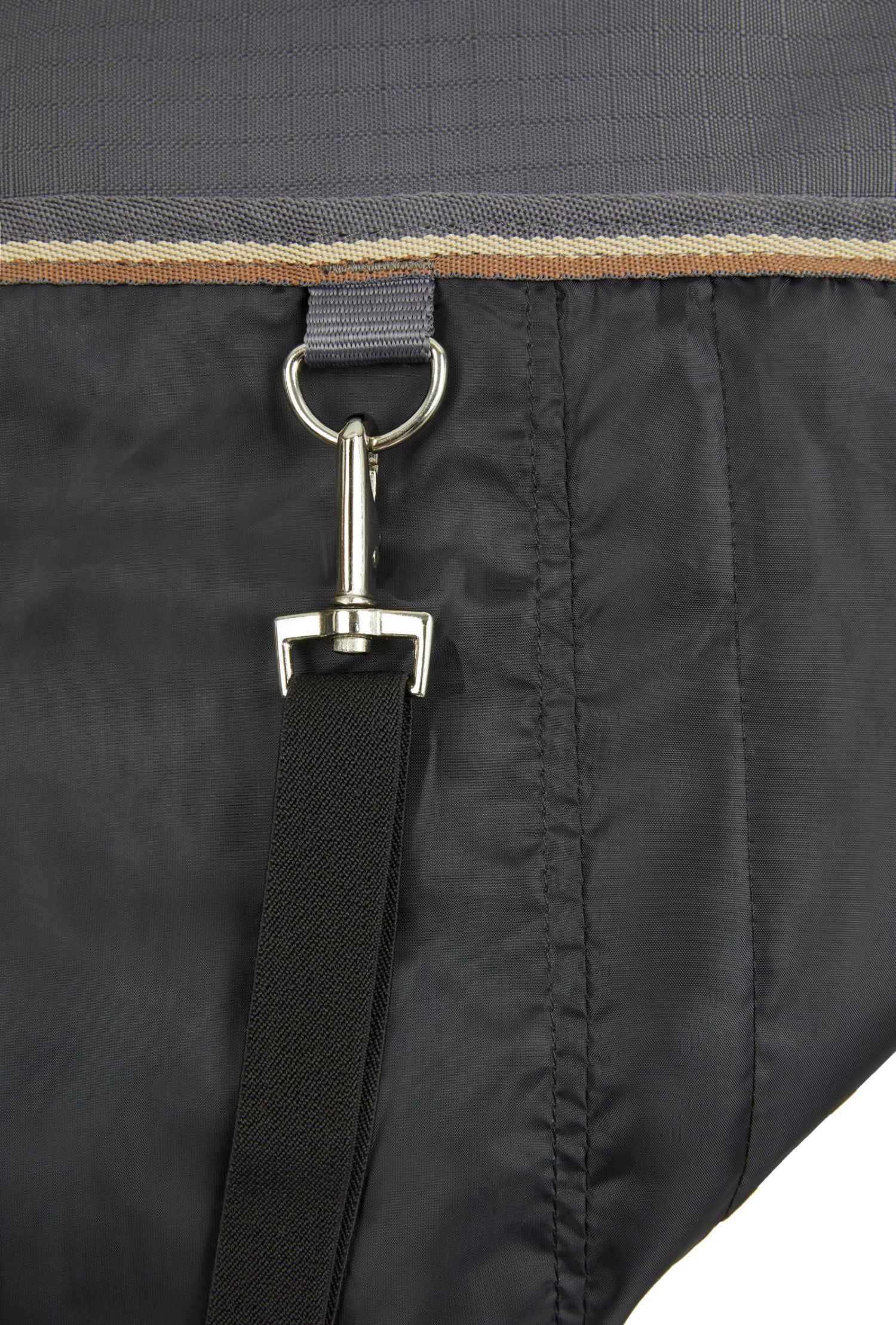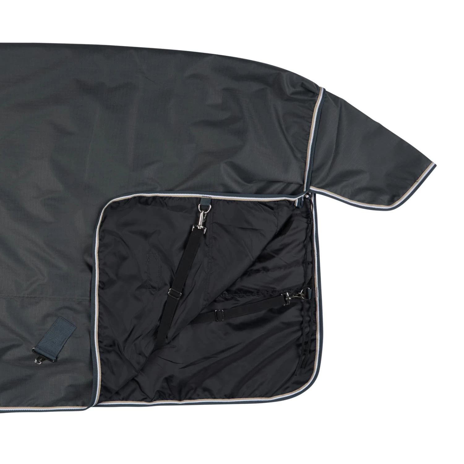 This rug is made from a waterproof, breathable fabric. The good fit at the neck and shoulder area makes it comfortable, and the high gusset allows lots of movement. The front buckles, X-surcingles, legstraps and tailflap secure the turnout.