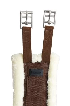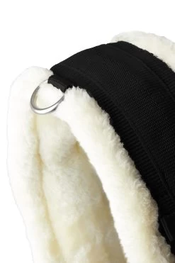 Faux fur padded long girth made of soft neoprene with elastics on both ends. The double layer elastics provide a sfot ‘give’ during movement, while still keeping the girth in place. The girth features roller buckles for easy girthing and a D-ring in the middle for easy attachment of auxiliary reins or breastplates. For incresased support a webbed tape is sewn along the outer neoprene. Also available as dressage girth (#14667). Rubber logo badge.
