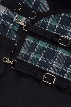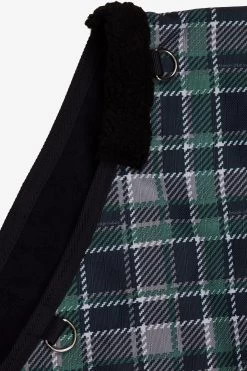 Our Horze Nevada turnout rug is made from durable waterproof material in checked design. Soft faux fur at the withers keeps your horse comfortable, and fleece lining keeps it warm. Two front buckles, X-surcingles, tail flap and leg straps keep this rug in place. High gussets maintain your horse’s freedom of movement. A neck piece can easily be attached with D-rings. Also available without fleece lining (#24575).
