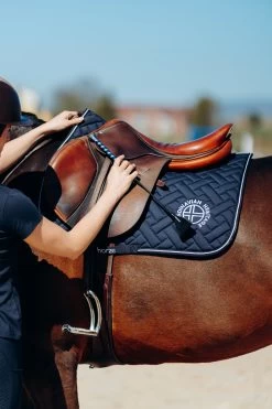 Our Horze Oslo saddle pad is made with breathable lining that keeps your horse cool in summer, and equipped with crossover quilting that adds an interesting look. Bright colours bring fun to your tack. Hook-and-loop and webbing straps keep this saddle pad in place. Pair it with our Horze Olso brushing boots and ear net for a full outfit.