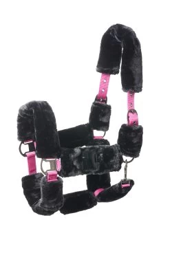Strong webbing covered with soft fluffy faux fur creates a durable halter that avoids chafing. Gunmetal fittings create an elegant look. Matching lead with panic hook (#22696) or snap (#22697) available.
