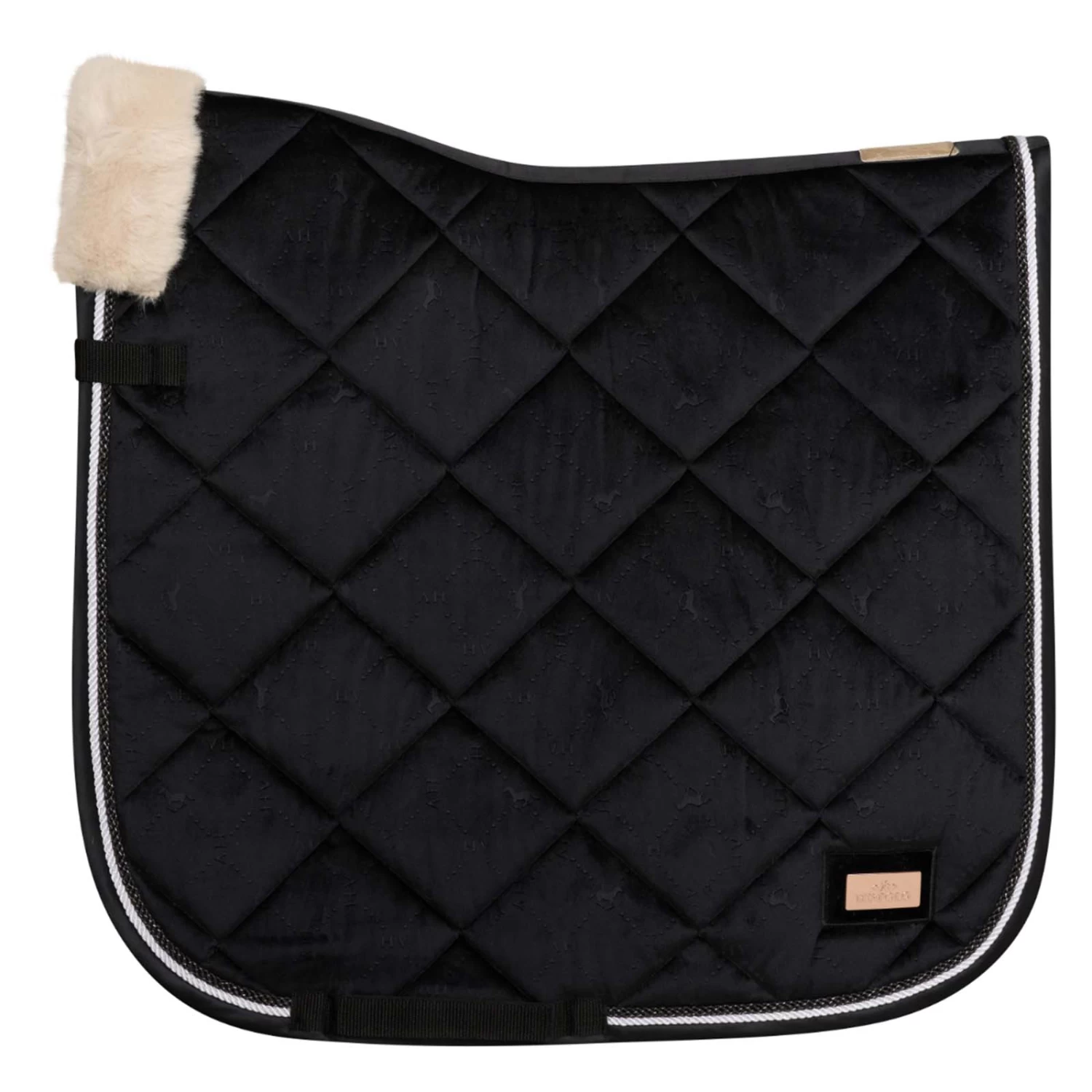 This chique saddlepad from the luxury collection in made out of velvet material with debossed all over brand logo. The backline and binding are made from shiny satin material and the saddlepad has a nice faux fur on the withers. It is all over stitched with squared quilting, has fancy cords along the binding, a PU badge at backline and a luxury metal plate.