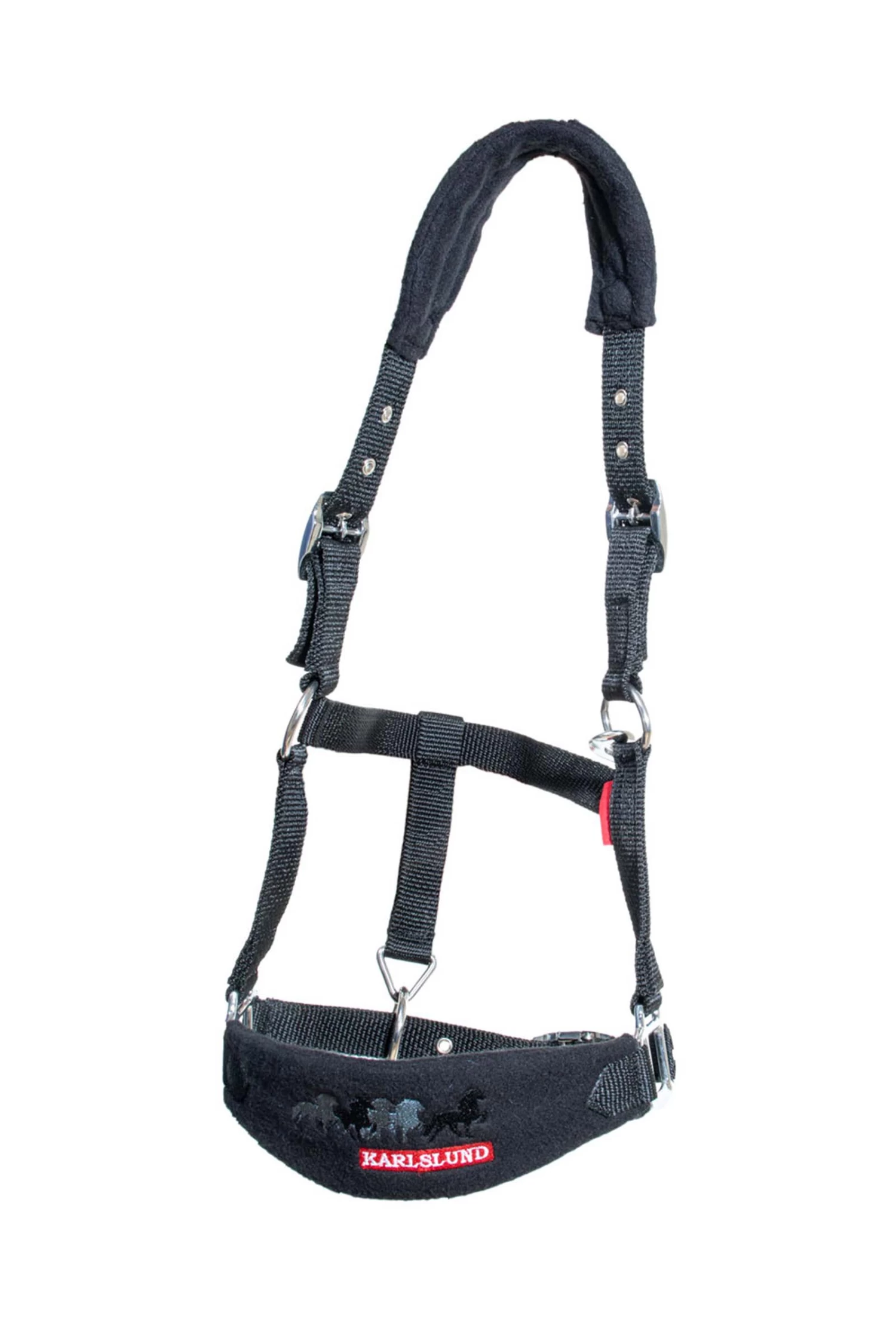 Beautiful nylon halter with soft fleece lining on the nose and neck piece, as well as adjustment around the muzzle and on both sides of the neck. On the nose piece there are tölting Icelandic horses
