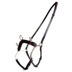 Bitless headstall with metal bar and 3 rings for attaching reins or lunging. Similar to the riding kapsun developed at Hólar, Iceland.