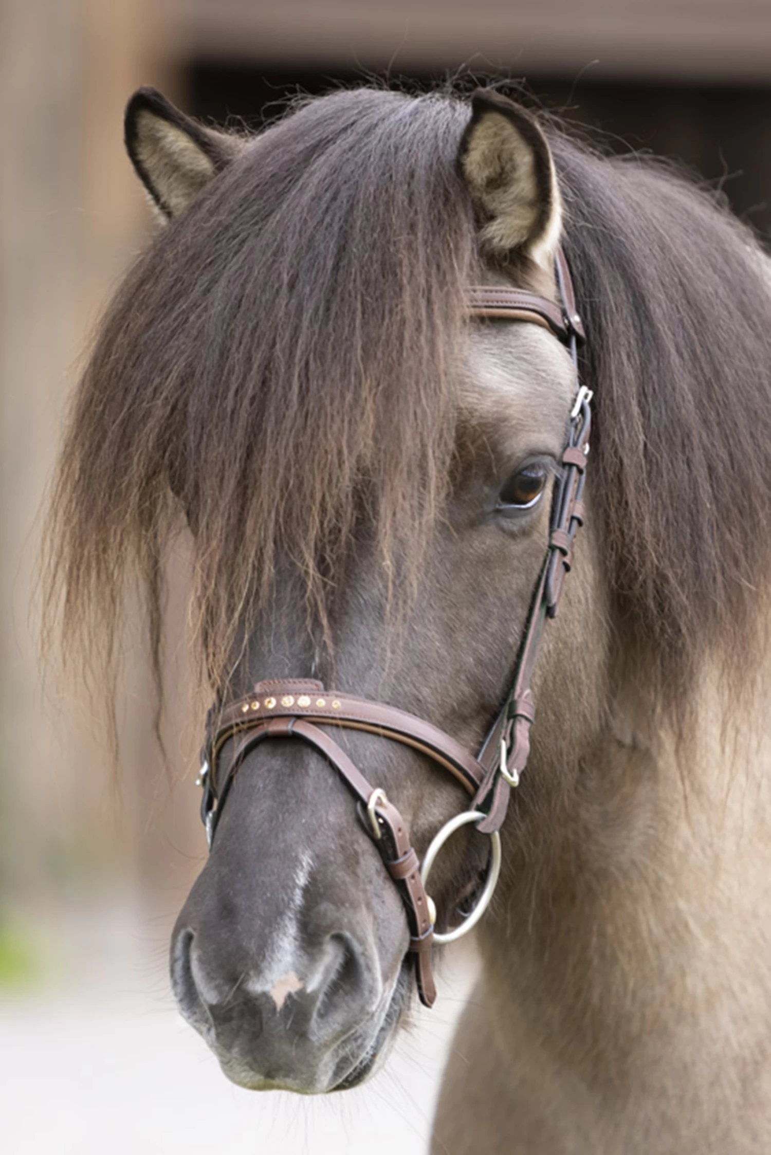The English “Gull” noseband in brown sparkles with different sized golden stones on the noseband. The flash strap is detachable.