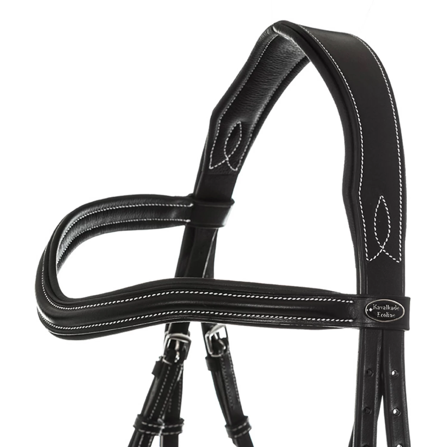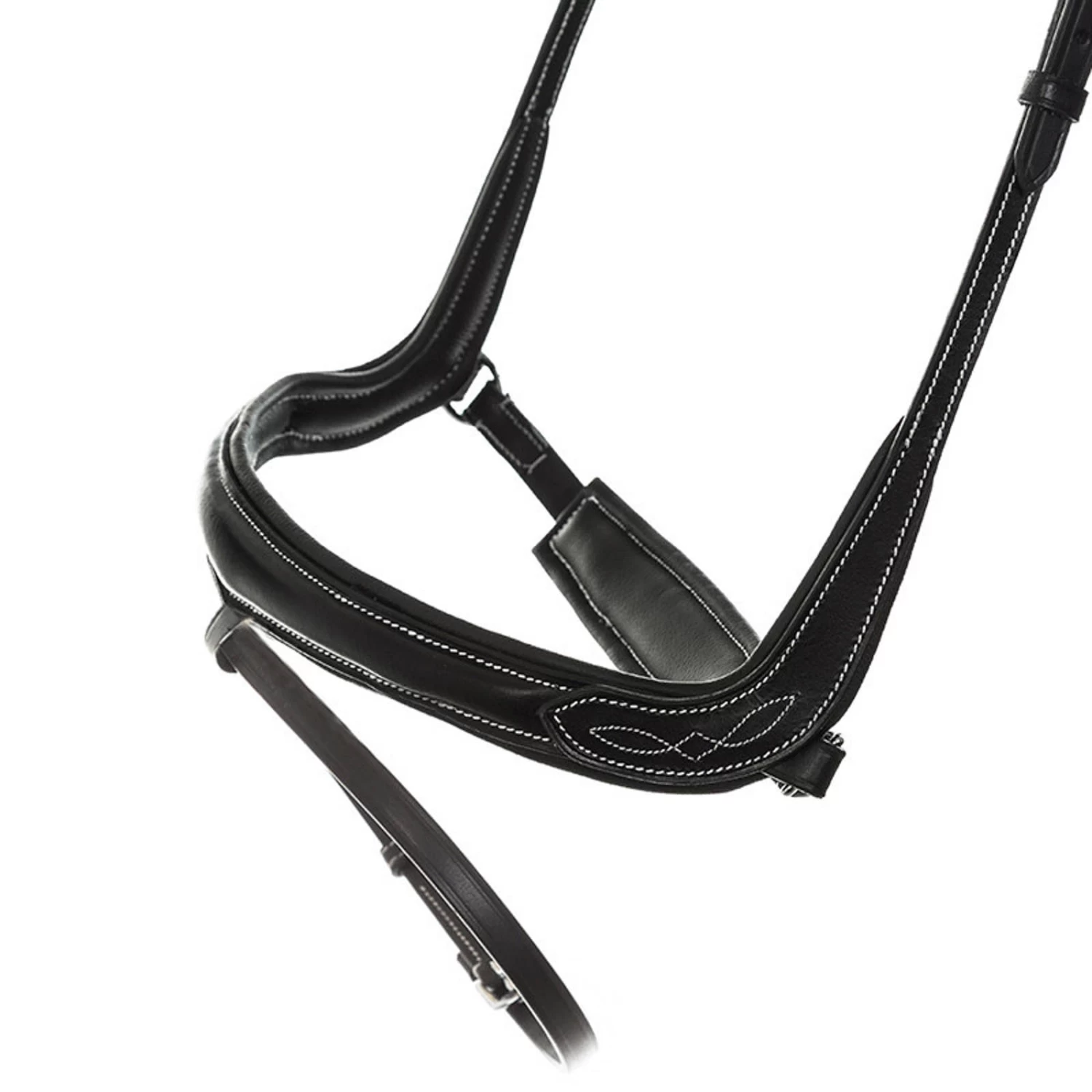 English-combined noseband, firmly sewn on both sides of the headpiece. Contrast stitching and decorative embroidery give a noble look. Noseband softly padded with special cut for even better action. Extra wide anatomically shaped headpiece provides extra ear freedom. Curved leather browband. Throat strap can be buckled on both sides. With rubberised reins.