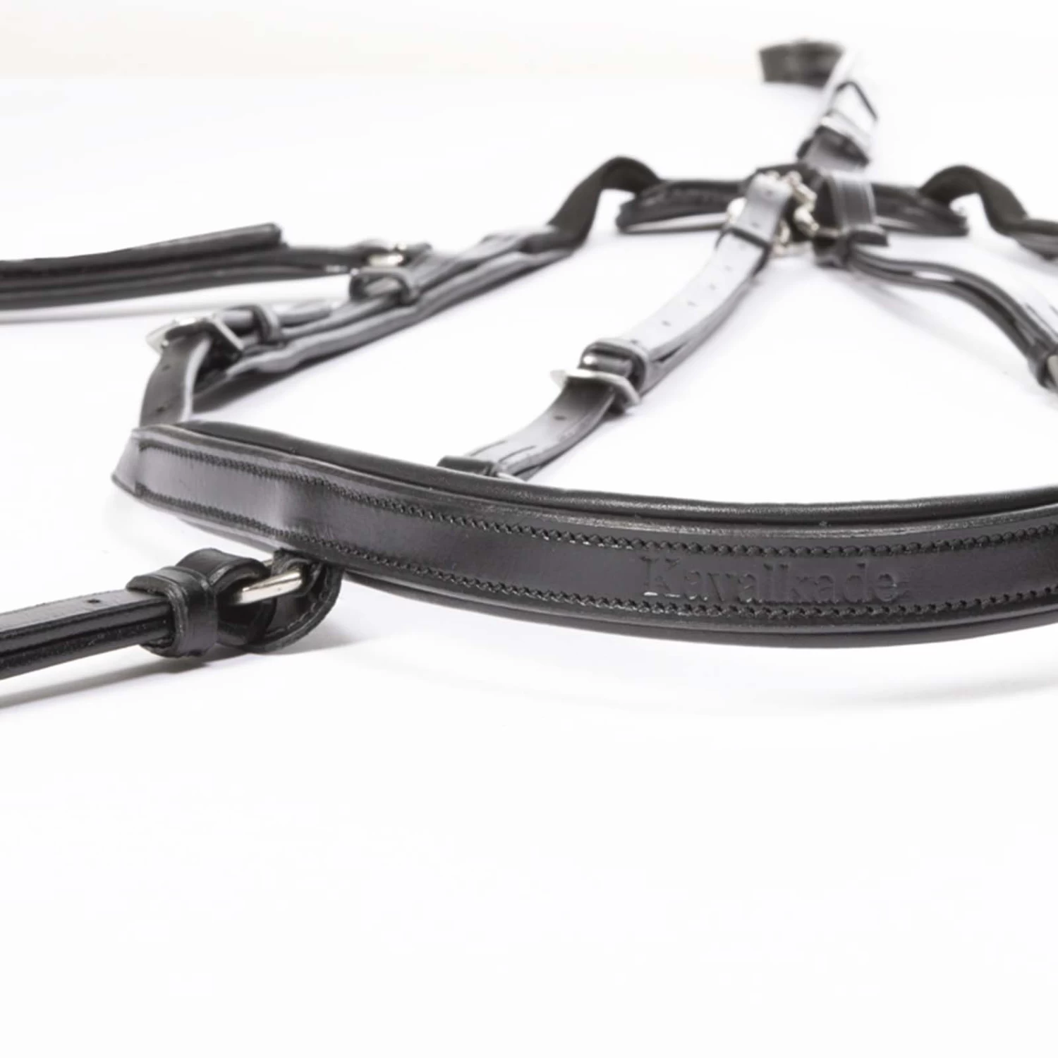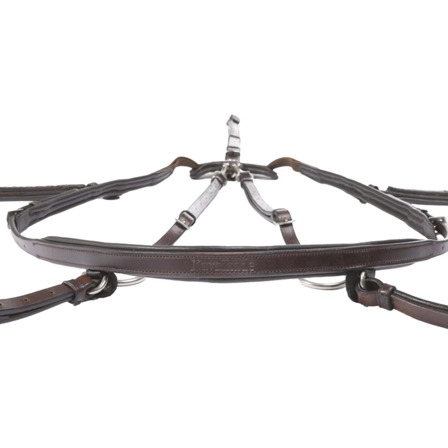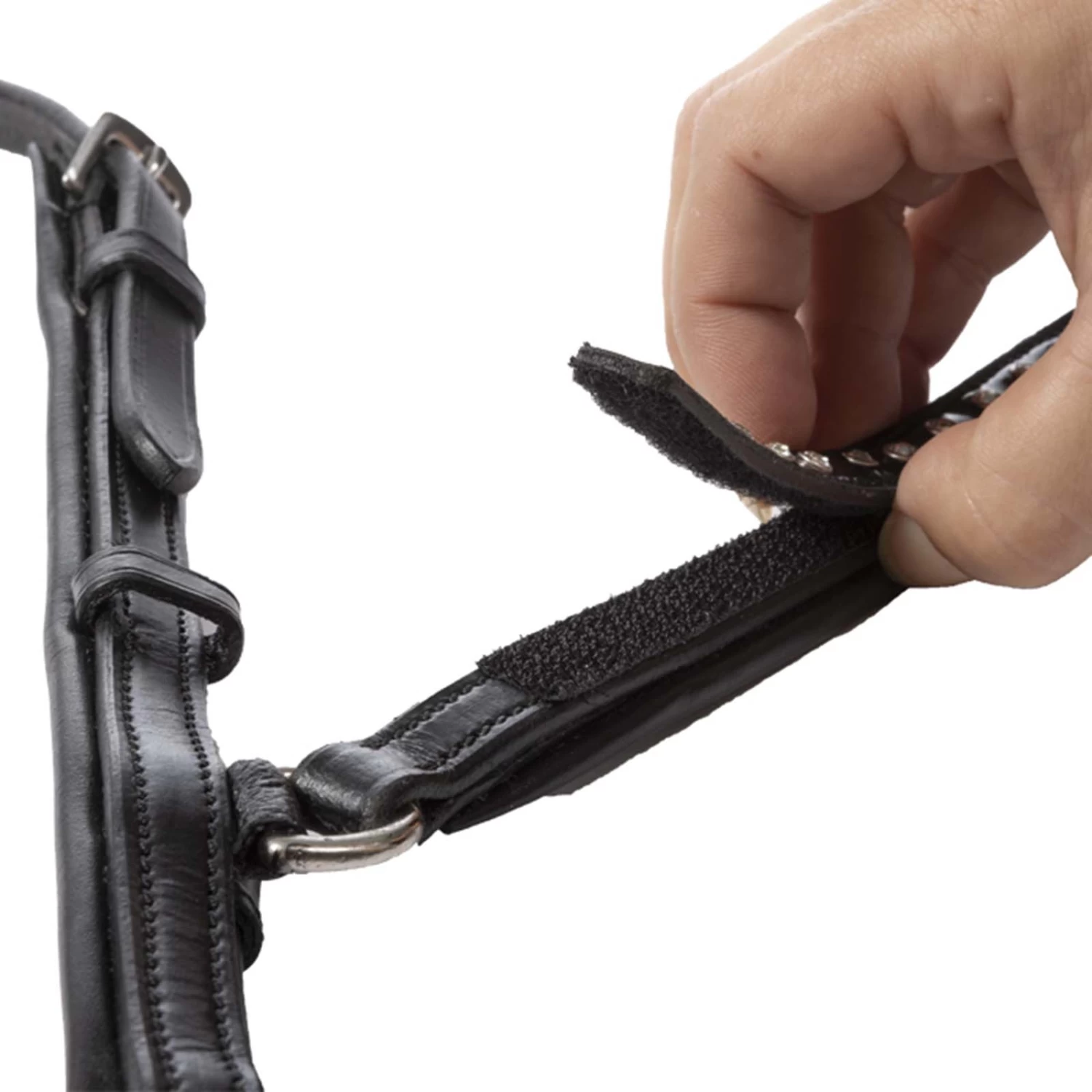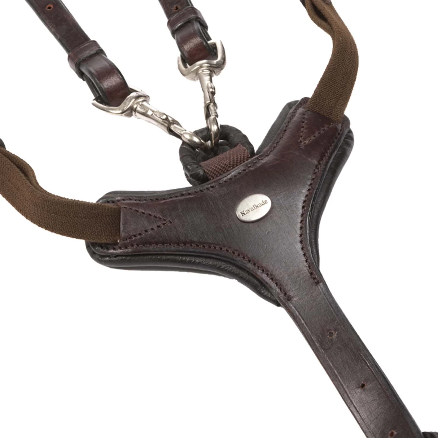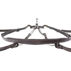 The 5-point breastplate with elastic has a narrow cut and can be adjusted in length several times. The breast girth strap is adjusted at the front of the breast so that it is no longer necessary to fiddle around under the horse’s belly. The lower girth fastening is achieved by means of a small leather loop. This means that there are fewer loops and buckles, which significantly reduces the risk of threading. The breastplate is supplied with a standard hook and loop patch.