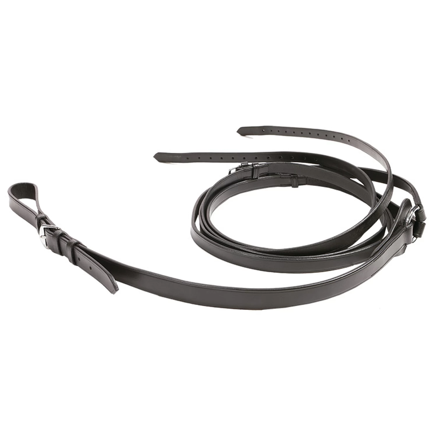 The Running reins are a modification of the side reins. The reins start between the front legs of the horse and go throuh the bit rings back to the lungeing girth or saddle. In contrast to the side reins the forward-downward movement of the horse is possible when using triangle reins and frames the horse to the side. The correct version to put on the running reins allows easy lifting of the horse’s head just before the vertical. The reins are widely used as training aids for riding training or lunging. Through different height position the running reins at the saddle girth, it is possible to vary according to the establishment of the level of training of the horse. The running reins of Kavalkade are very cheap and are made of high quality leather and can be customized. Dreieckszügel are also used a lot also in therapeutic riding and hippotherapy.