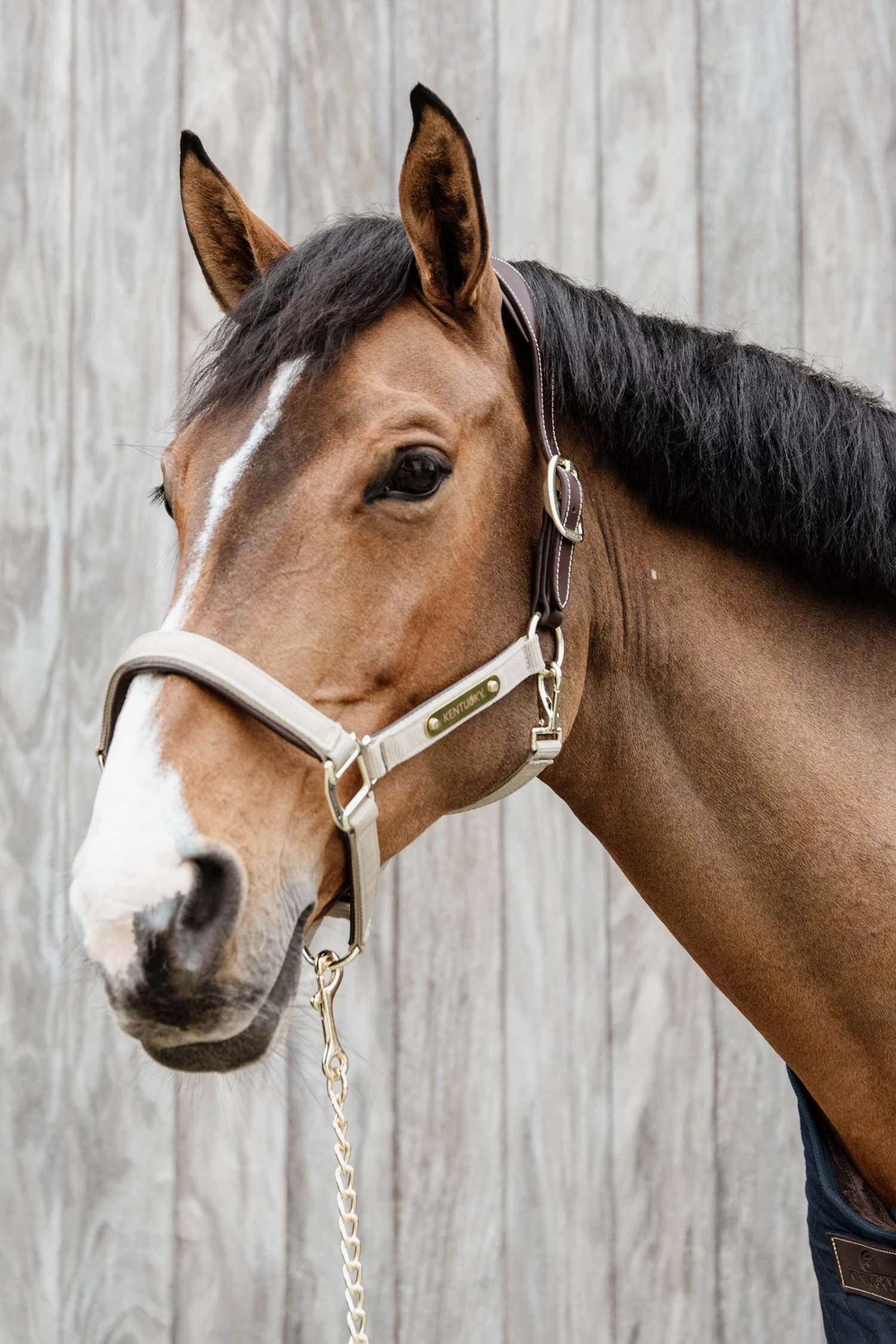 The halter is available in size full and COB. The neckpiece is anatomically shaped for more comfort. To adjust the halter, you can use the 2 buckles on the side of the neckpiece. The nameplate on the halter can be turned over and engraved with the name of your horse.