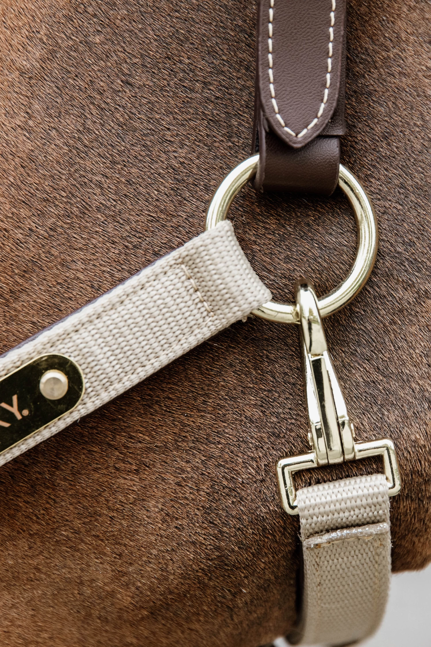 The nylon anatomic halter is made from artificial leather. A material that is stronger and more durable than real leather. Artificial leather does not change color, nor is it affected by water. The halter is finished with nylon, this makes the halter stronger and creates a chic look.