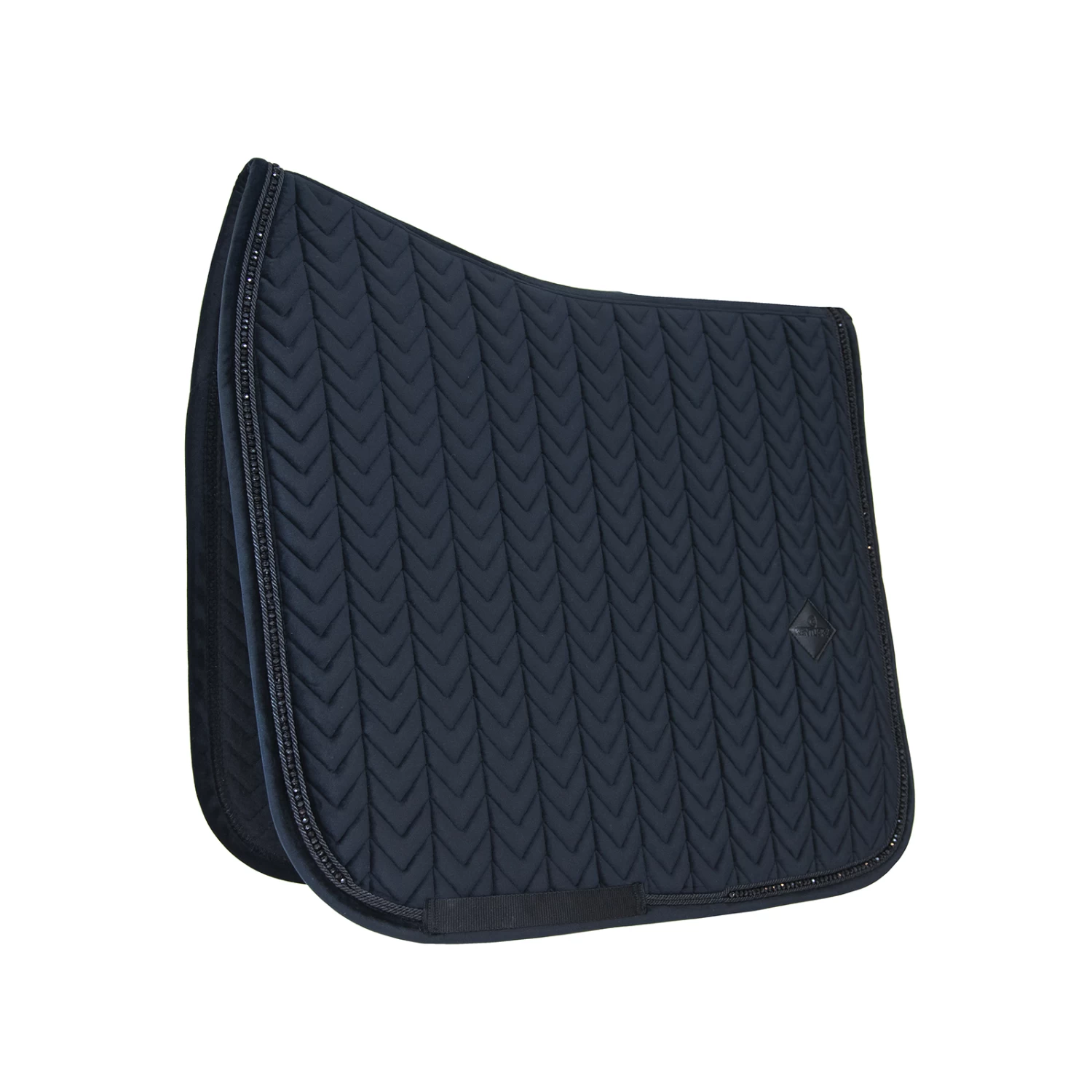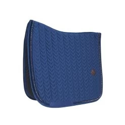 Made with only the best materials, the saddle pad velvet pearls is not only pleasant for the eye but also for your horse to wear. The saddle pad comes in different colors to match any type of horse. The outside of the saddle pad is made from our famous and soft velvet fabric in fishbone quilting. The piping is finished off with chic pearls. The lining of the saddle pad is a cotton and polyester mix which easily absorbs sweat and is very breathable. The Velvet Pearls Saddle Pad has no annoying straps to attach to the saddle. To stay in place under the saddle, the inside of the pad is waffle structured. This waffle structured inside is quick-dry and offers a cushioning effect under the saddle. To make sure your boots are not damaged by the pearls, there’s a special pearl cutout next to the girth straps. The artificial leather logo patch is placed a little higher on the saddle pad so there’s still room for embroidery.