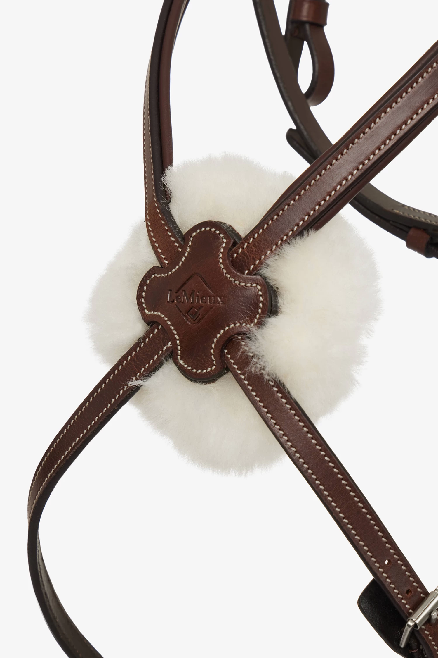 A D-ring joins the noseband and cheek pieces, allowing the pieces to sit smoothly against the horse’s cheeks and jaw. This helps to provide a tailored fit for different jaw shapes and the back strap can move independently.