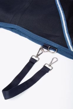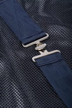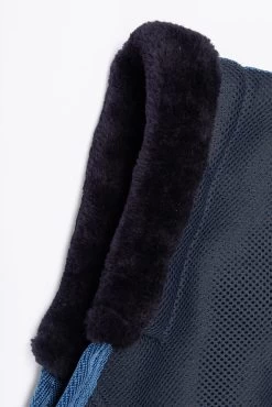 This cooling rug features an upper part made of 3D air mesh and a lower part made of single birdseye mesh for superior breathability. The rug is finished with polyester webbing and off-white and mid-blue striped tape between the mesh qualities. A single velcro closure with a T-buckle at the front provides a secure fit, while crossed detachable surcingles and a tail band with two snap hook closures secure the underside. Printed with a white PS of Sweden logo on either side, all metal details have a silver finish, while faux fur decorates the neck. The front part of the rug is lined for additional comfort.