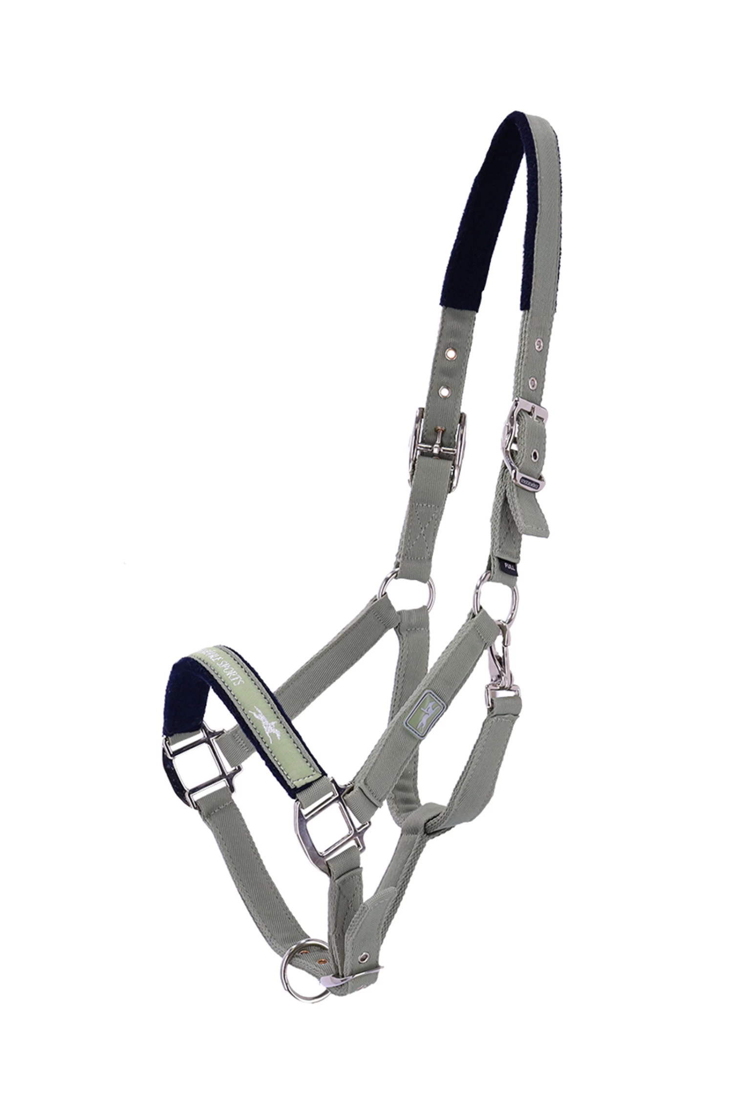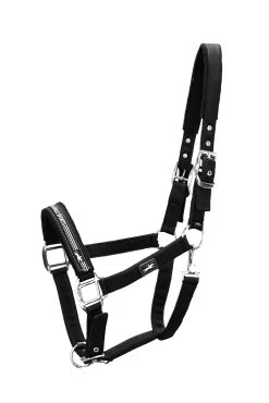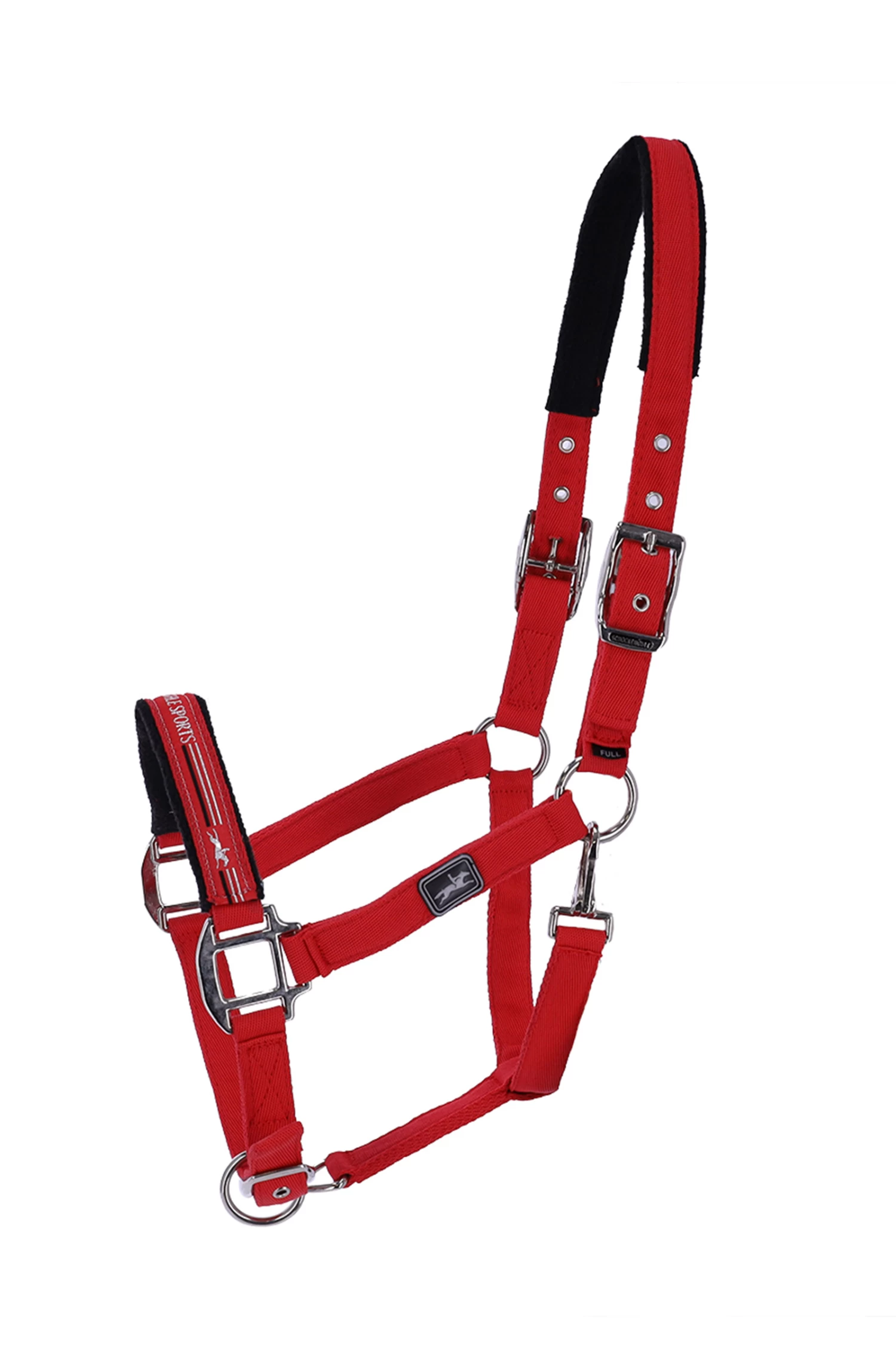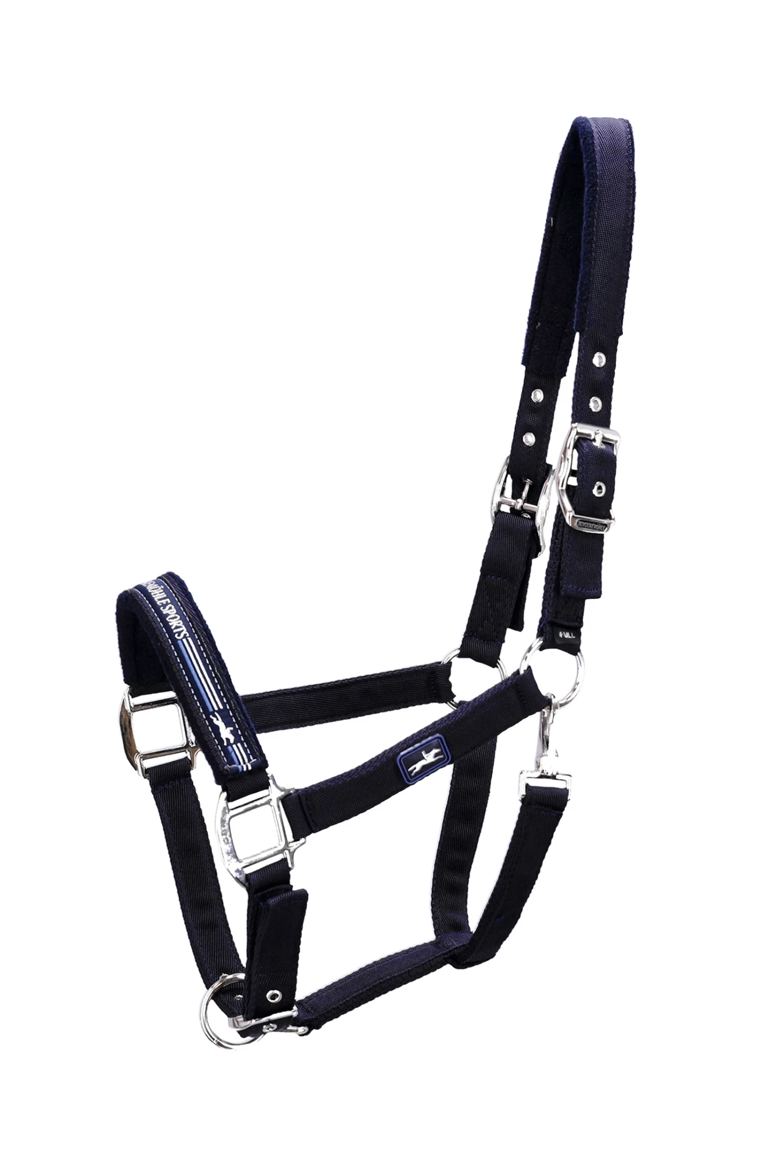 - Sporty halter made of soft nylon||Head piece and noseband padded with soft fleece||Woven logo label on the noseband and rubber badge on the cheek piece