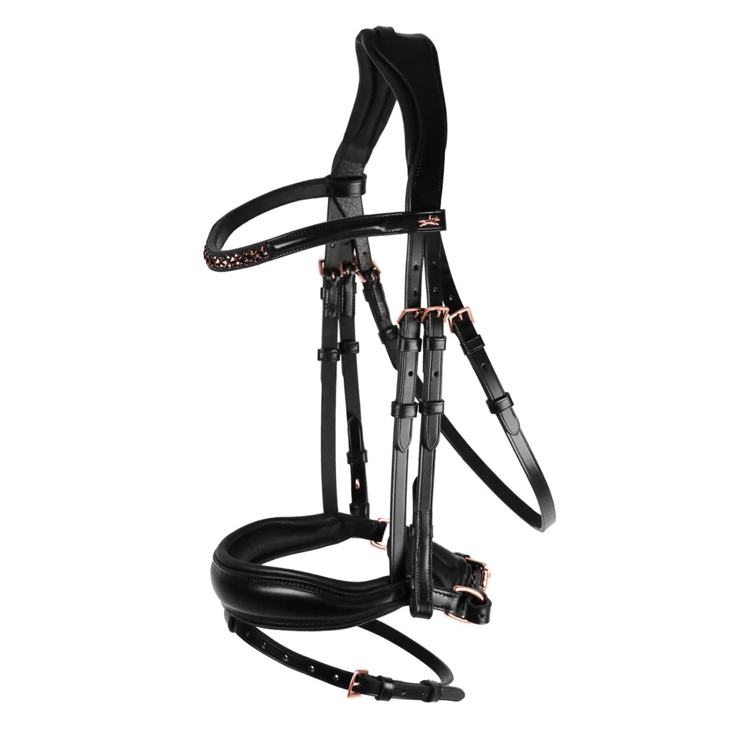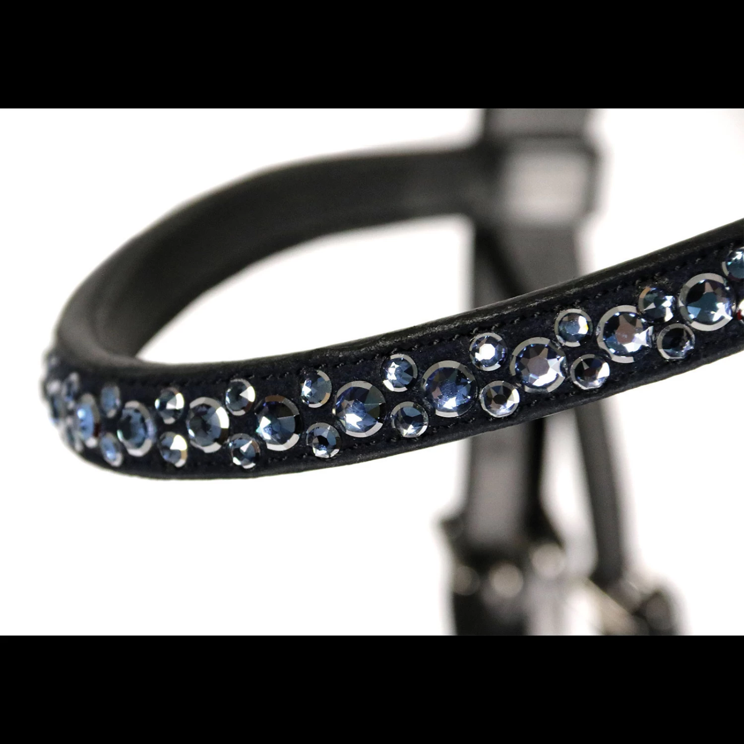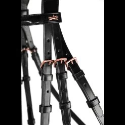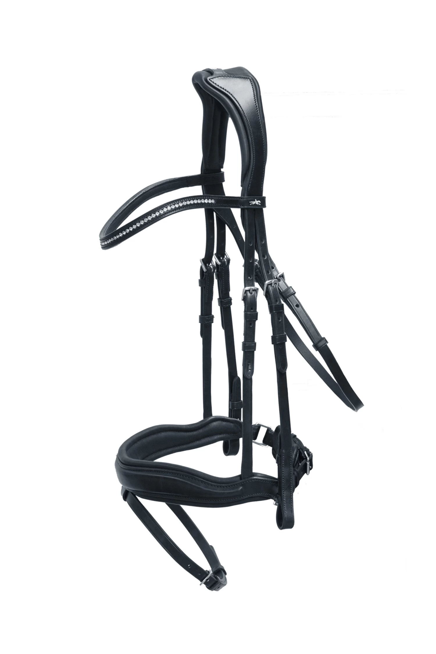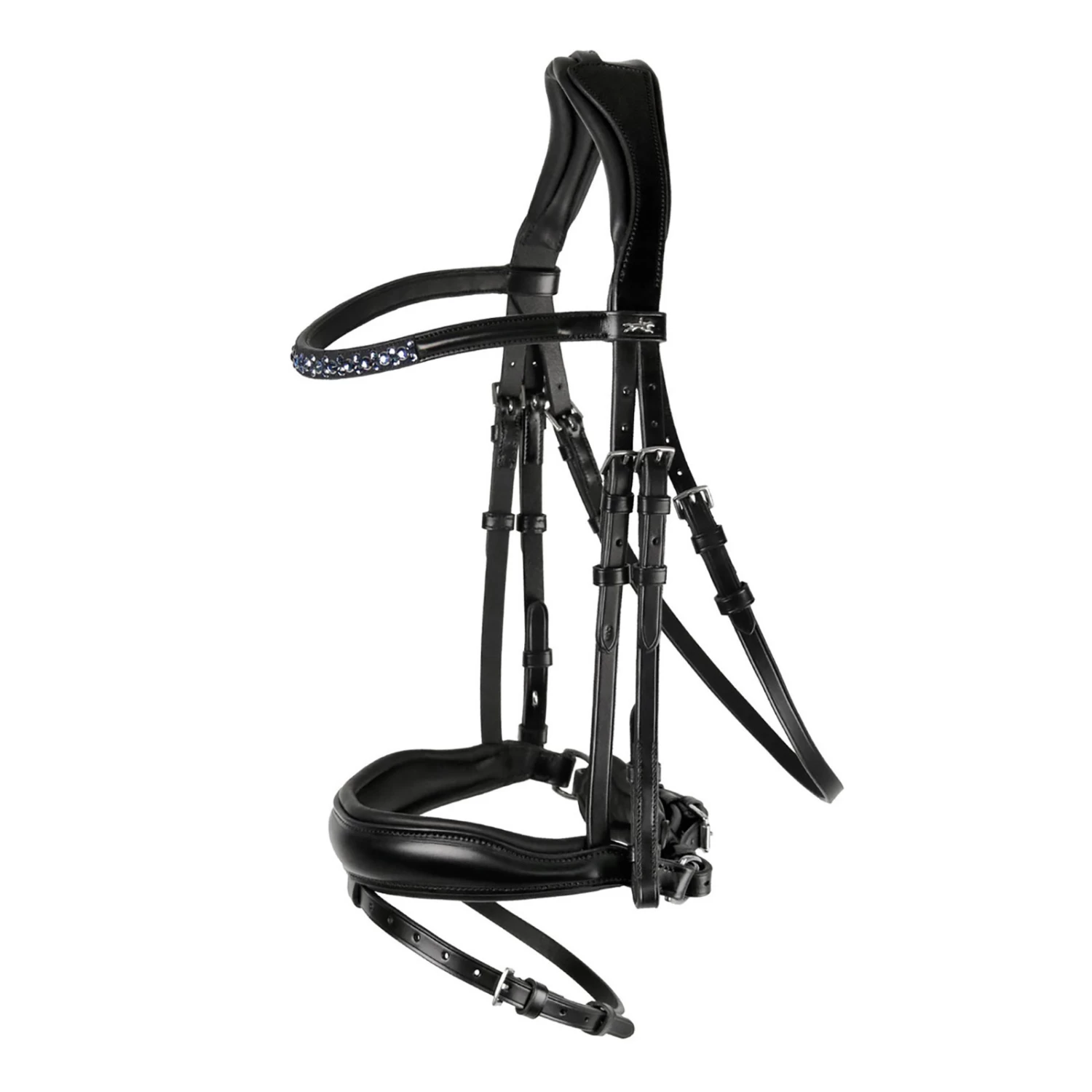 - Anatomical bridle in sporty look with pre-shaped crank noseband, front approx. 50 mm wide||Pressure reducing head piece||Flat side parts||Cheek pieces with hook and stud||Throatlash adjustable on both sides||Special edition: new colour combination of the bestseller Stanford equipped with one browband with Swarovski® crystals