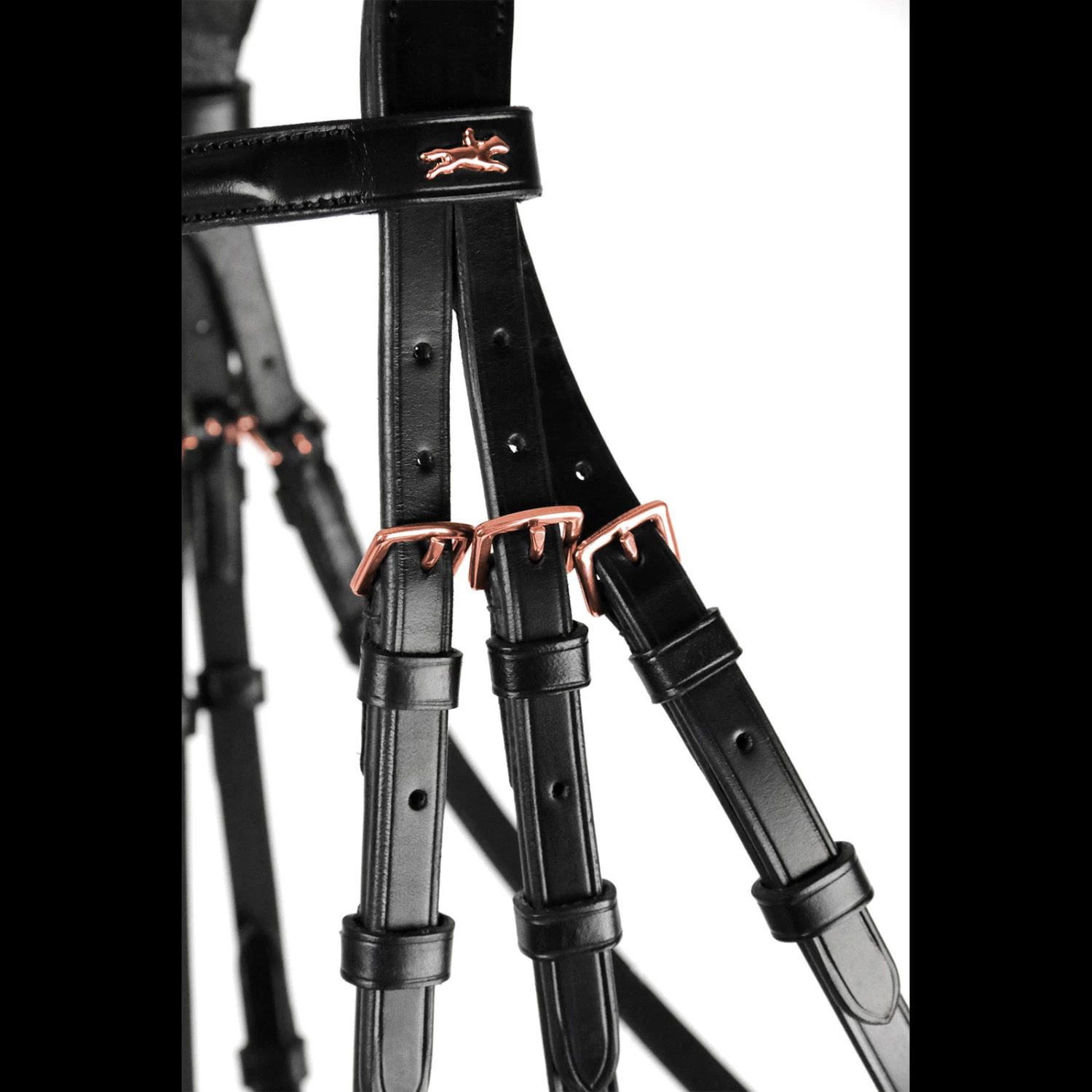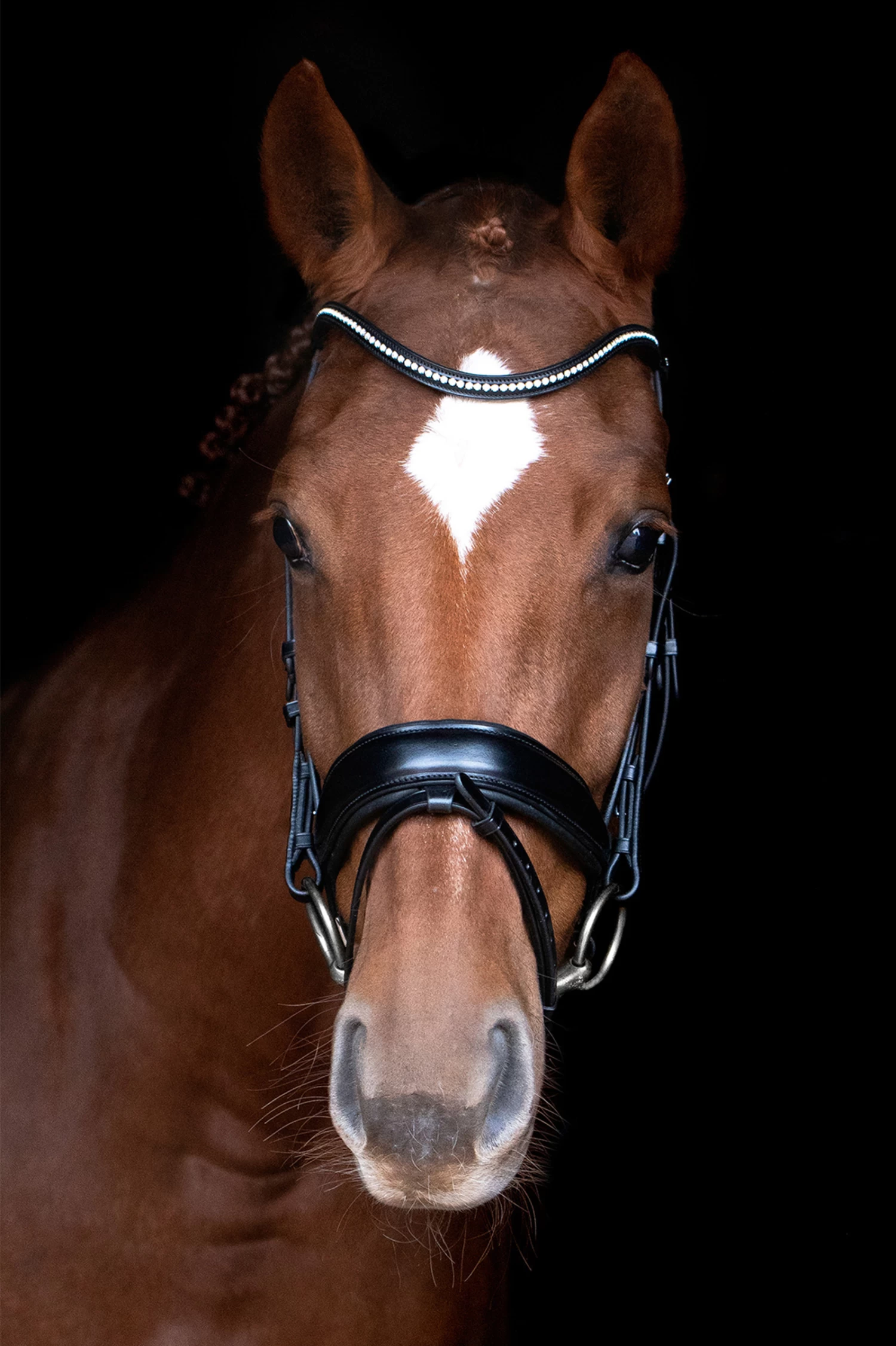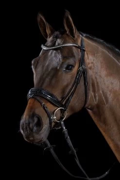 STANFORD S combines functionality and nobel design: The bridle with an anatomically shaped crank noseband has a unique neck piece. This was specifically adapted to the horse’s anatomy and allows unconfined movement of the ears. Due to the reduction of pressure in sensitive areas around cheekbone and neck, the comfort of the horse is considerably enhanced. For the special appearance STANFORD S is equipped with a coloured browband with blue or red Swarowski® crystals. The red version also has rose-gold fittings – a very special highlight!