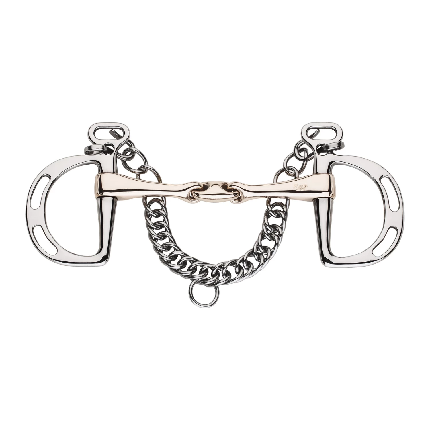 Works in a similar way to a Pelham. It is ridden with two reins and the use of a curb chain puts additional pressure on the horse‘s poll. However, the lever action is considerably less due to the shorter D-Ring shaped cheeks, resulting in less pressure.KK ULTRA – Compared to conventional bits, the double jointed KK ULTRAs have a middle link – also known as the bean – that is shortened and angled forward by 45°.Only with this angle the middle link lies gently on the tongue resulting in even and constant contact to allow clear instructions through the reins.The innovative KK ULTRA bits take advantage of the exceptional sensitvity of the horse‘s tongue which multiplies the perceptions from signals given by the bit. When the reins are pulled the middle part of the KK ULTRA fully rests on the tongue without squeezing and the connection rings roll on the tongue. The tongue‘s sense of touch is utilised and clear instructions can be given.The KK ULTRA bits provide an incomparable precisely contact between rider and horse. A huge improvement can normally be seen immediately when switching to a KK ULTRA bit.The anatomically adapted mouthpiece is very comfortable for the horse as the rider can give softer instructions and the horse‘s suppleness is supported harmoniously.