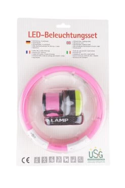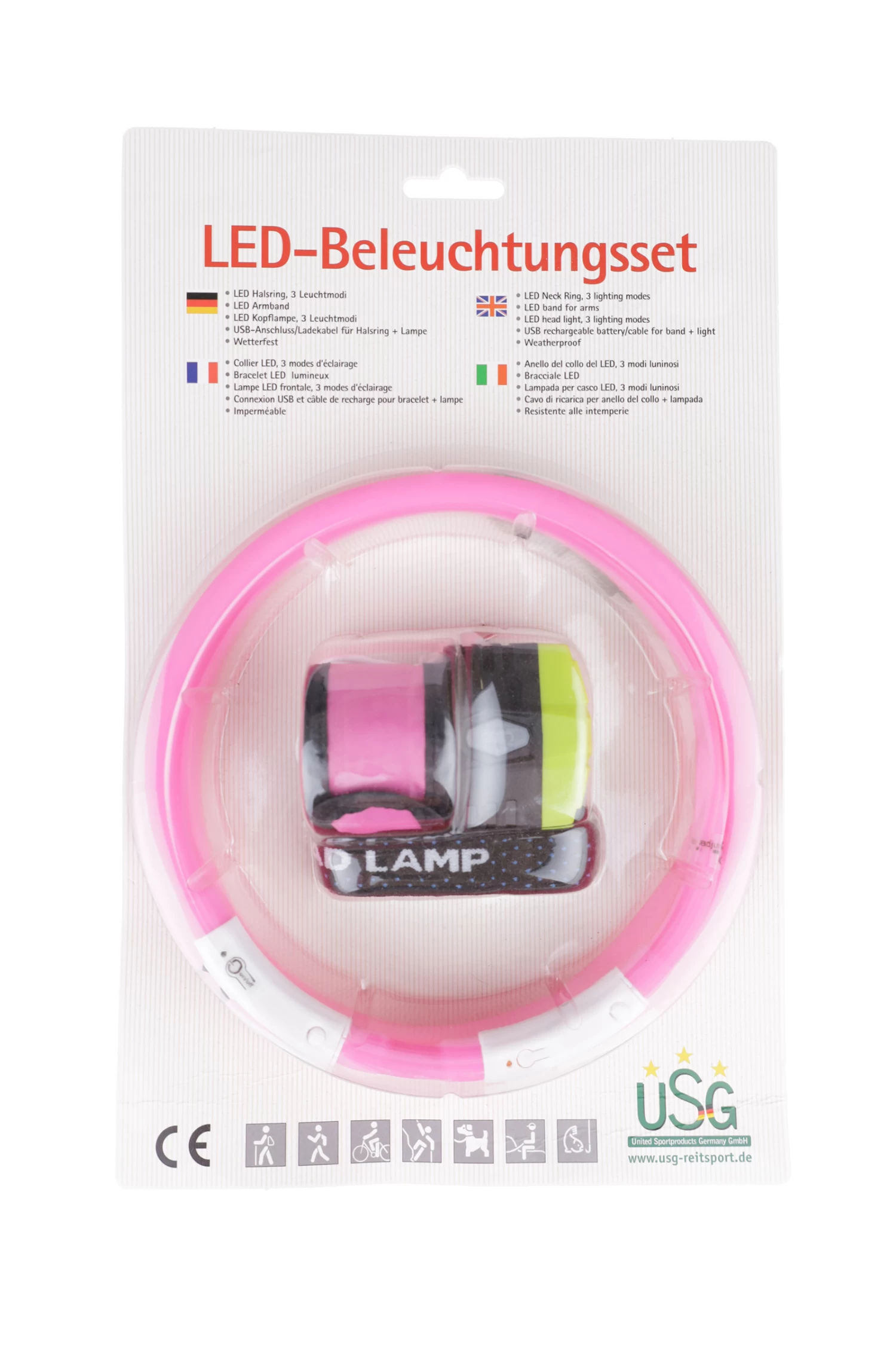The LED lighting kit for safe riding in twilight and dark comes with three components: a LED neck ring with 3 light modes for the horse, a LED wristband for the rider and a LED head light with 3 light modes. The head light and neck ring can be easily recharged via USB port with the included charching cable. The whole set is weatherproof. So nothing can stop you from safe riding in the darker seasons!