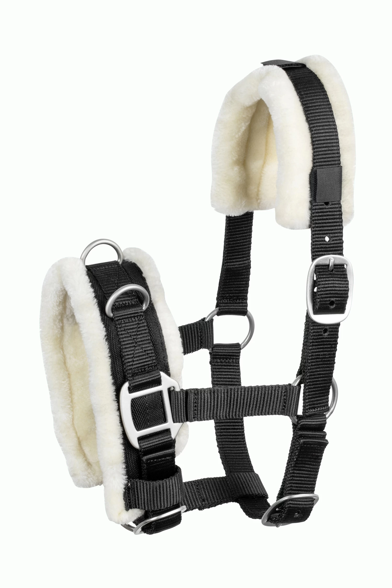 Shetty-Cavesson for lunging and leading. Black coloured Nylon for easy care, with silver coloured fittings. Stepless adjustable. The artificial fur underneath the neck part is removable.