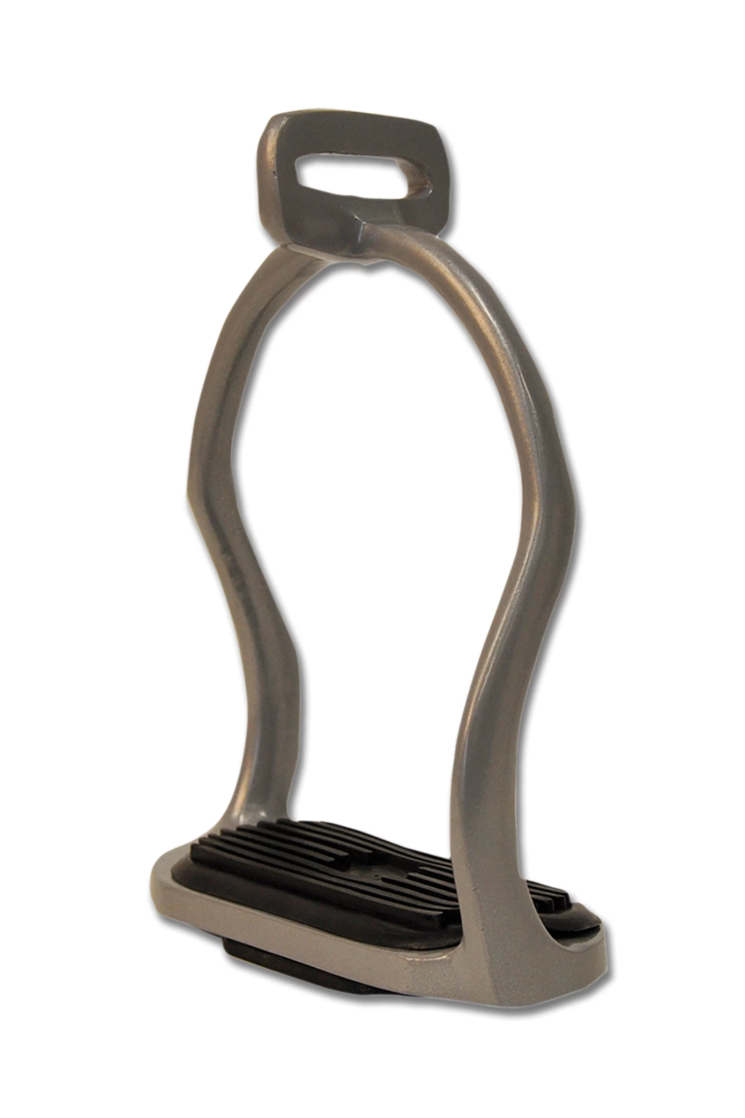 Curved shanks with eye for stirrup leather at 90°. Black tread inserts, pair.