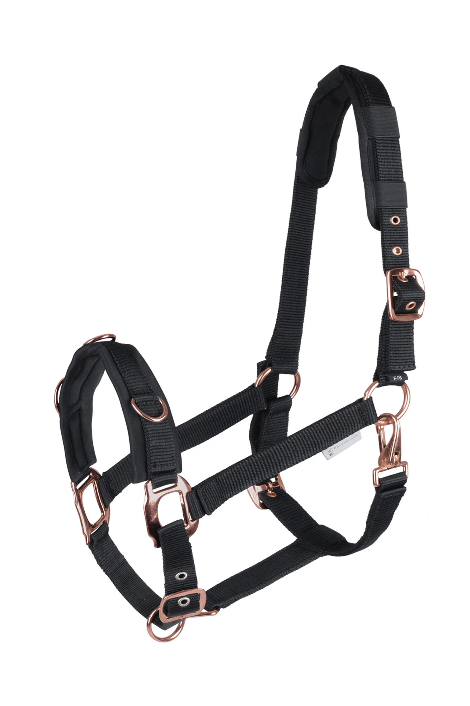 Light, durable lunging halter in nylon webbing. Adjustable at headpiece, chin and throat straps. Softly padded at headpiece and noseband. With rose gold fittings.