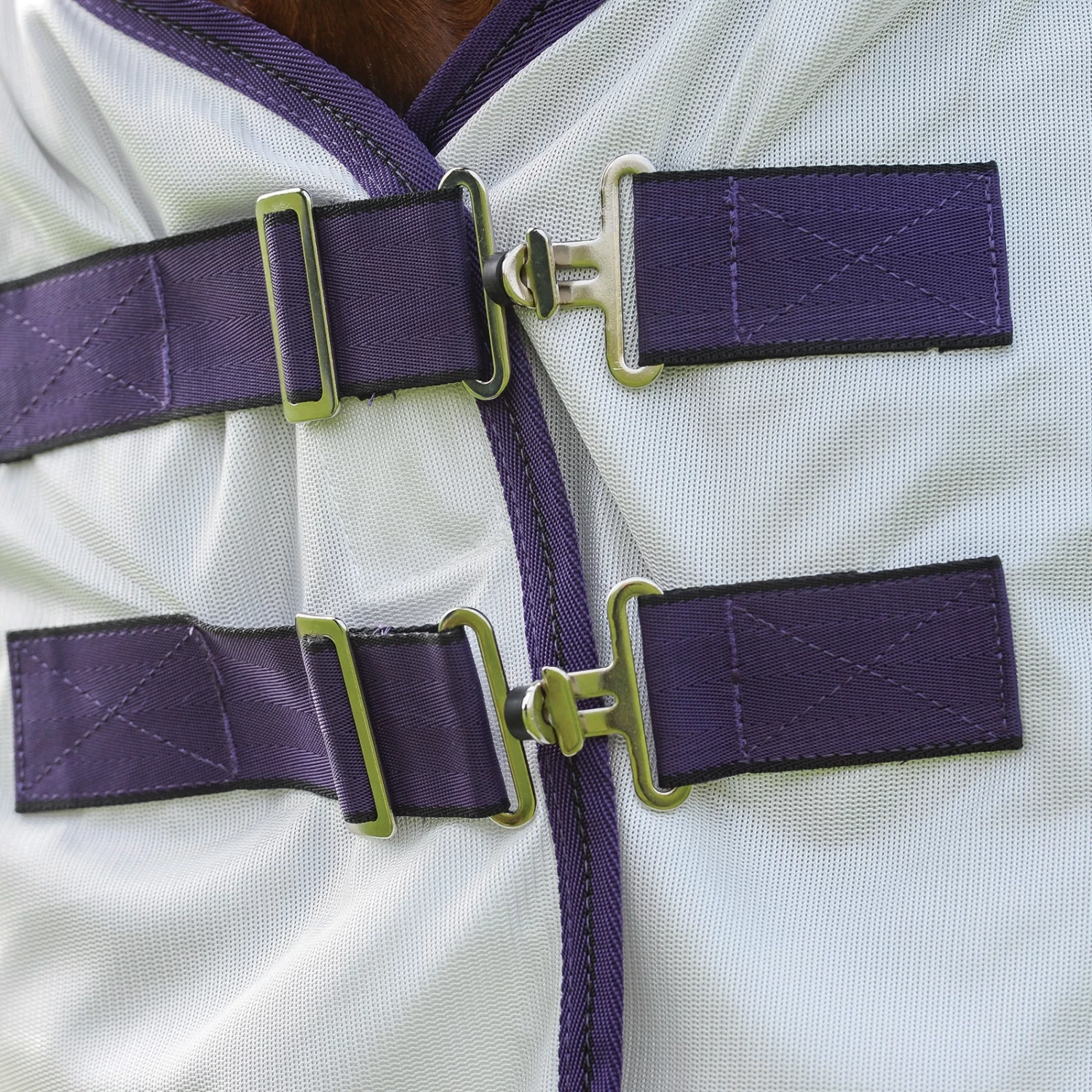 Softmesh fly protection with 210T nylon lining at the shoulders, mane and tail, featuring new twin adjustable surcingle front closure, traditional side gusset for freedom of movement, low cross surcingles, large tail flap and adjustable removable leg straps.